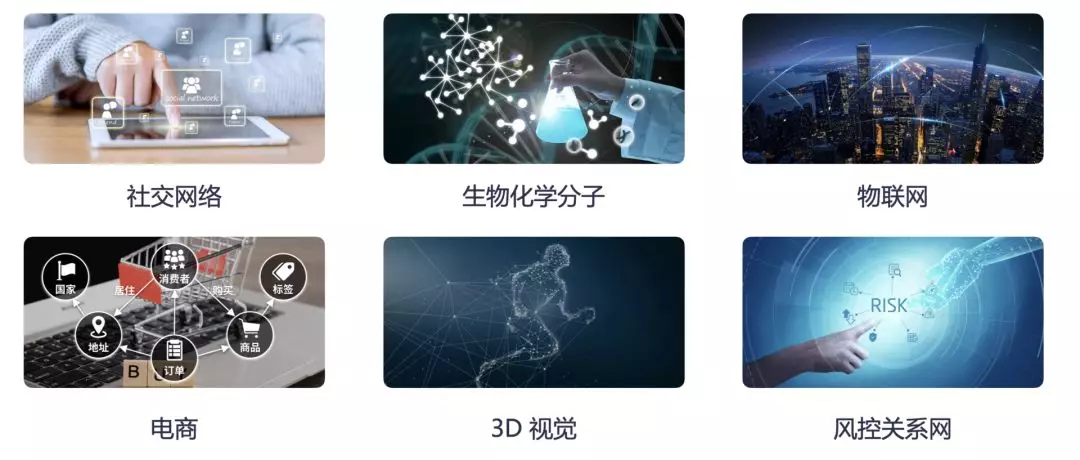 近几年,以深度学习为代表的人工智能技术给产业界带来了新的变革。该技术在视觉、语音、文本三大领域取得了极大的应用成果,这种成功,离不开深度学习技术对这三类数据定制化的模型设计工作。脱离于这三类数据之外,图数据是一种更加广泛的数据表示方式,夸张地说,没有任何一个场景中的数据彼此之间是孤立存在的,这些数据之间的关系都可以以图的形式进行表达。下图给出了一些图数据的使用场景: