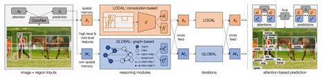 文献[15]为了解决上述的局限,提出了一个融合了空间信息和语义信息的迭代式视觉推理系统。整个系统有两个核心的模块,一是在卷积网络基础上引入了记忆机制的局部推理模块,二是融合了空间和语义信息的全局推理模块。整体的推理框架如下图所示。