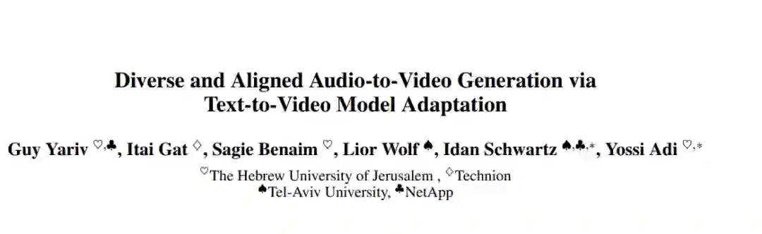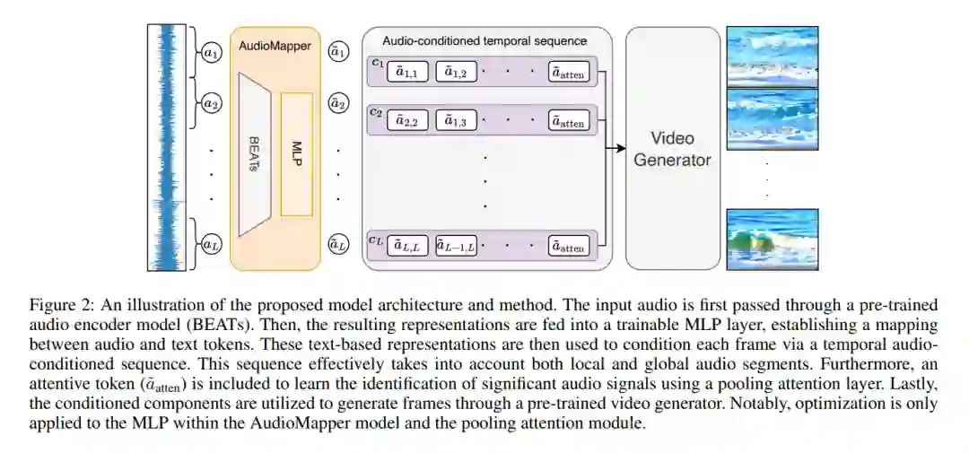 我们考虑的任务是在广泛的语义类别中,由自然音频样本引导生成多样化且真实的视频。对于这个任务,视频需要在全局和时间上与输入音频对齐:在全局上,输入音频与整个输出视频在语义上相关联;在时间上,输入音频的每个片段与该视频的相应片段相关联。我们利用了现有的基于文本条件的视频生成模型和一个预训练的音频编码器模型。所提出的方法基于一个轻量级适配器网络,它学习将基于音频的表示映射到文本到视频生成模型所期望的输入表示。因此,它也能实现基于文本、音频,以及我们所能确定的首次,基于文本和音频的视频生成。我们在三个数据集上广泛验证了我们的方法,这些数据集展示了音频视频样本的显著语义多样性,并进一步提出了一个新的评估指标(AV-Align),以评估生成视频与输入音频样本的对齐程度。AV-Align基于在两种模态中检测和比较能量峰值。与最近的最先进方法相比,我们的方法生成的视频与输入声音在内容和时间轴上更好地对齐。我们还展示了我们的方法生成的视频具有更高的视觉质量和更多样化。代码和样本可在以下网址获取:https://pages.cs.huji.ac.il/adiyoss-lab/TempoTokens。