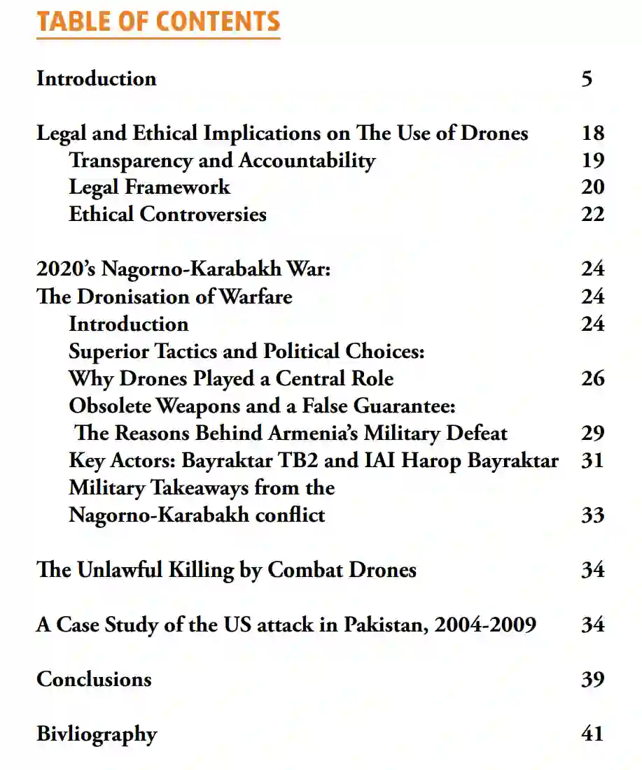 最后,将解释两个案例研究:第一个是关于纳戈尔诺-卡拉巴赫争议地区44天的战斗(2020年),它提供了一个样本,说明这些武器可能对特定冲突的结果产生巨大影响;第二个是关于2004至2009年美国在巴基斯坦的攻击。它描述了缺乏规范在战场上使用军用无人机的国际法,以及由此产生的非法杀戮。