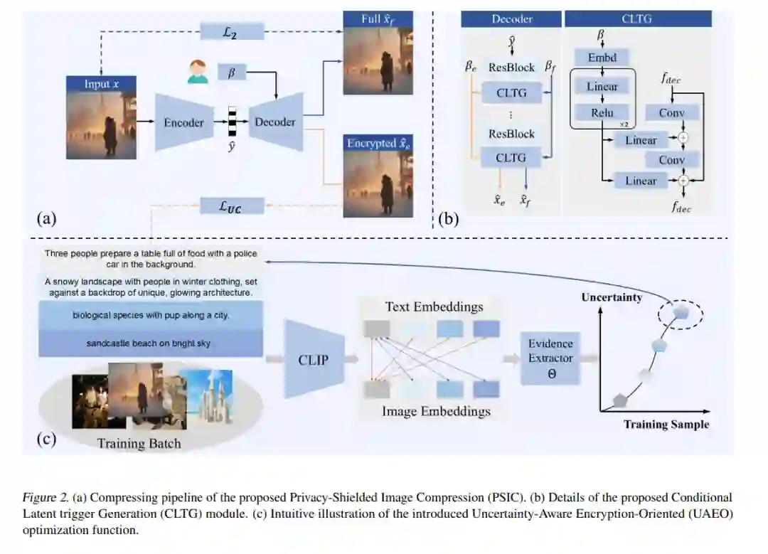 此外,该方法仍保留了原有的图像压缩功能。在提供可定制的输入条件下,PSIC 可重建保留完整语义信息的图像。我们提出了一个条件潜变量触发生成(Conditional Latent Trigger Generation,CLTG)模块,用于根据定制条件生成偏置信息,引导解码过程生成不同的图像版本。同时,我们设计了一个不确定性感知的加密优化函数(Uncertainty-Aware Encryption-Oriented,UAEO),通过利用目标 VLP 模型对训练数据的不确定性推断出的软标签,来提升对抗能力。