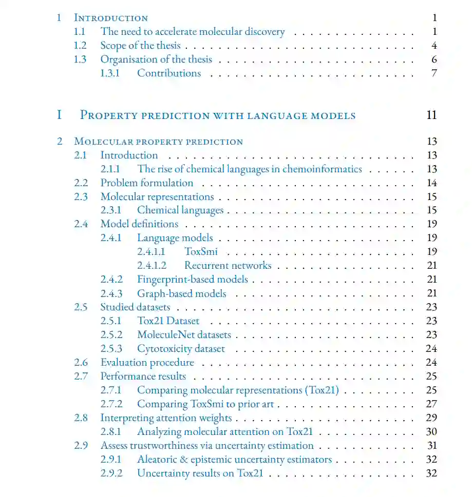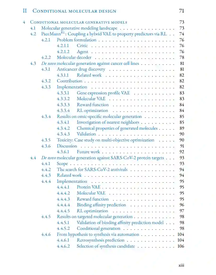 作为生成建模的先决条件,这篇论文的第一部分致力于构建分子性质的预测模型。第一章提出了一个简单而稳健、可解释的化学语言模型,该模型大量依赖数据增强,并被证明在一系列性质(如毒性)上表现出强大的性能。接下来的一章发展了用于预测蛋白质-配体结合亲和力的蛋白质化学度量语言模型,并证明通过从蛋白质序列中去除超过95%的残基,人类蛋白质激酶的结合亲和力预测性能显著提高。这篇论文的第二部分关注的主要目标是开发条件性分子设计的生成语言模型。利用强化学习优化方案中的性质预测器,得出一个可以在生物分子环境向量(例如,恶性肿瘤的基因表达签名或一个目标蛋白质)上进行条件设置,并生成对此环境具有高亲和力的分子的生成模型。实验证明,这种方法具有很好的泛化性,即使在缺乏实验数据的情况下,也能提出具有高选择性的分子,针对未见过的蛋白质目标。在关于加速分子发现的案例研究中,提出的生成模型被集成到一个完全自动的工作流程中,这个过程涵盖了回溯合成模型,合成协议生成,以及在机器人硬件上成功进行湿实验室合成。最后一章提出了一个多任务语言模型,将回归抽象为条件序列建模问题,从而统一了前面关于分子性质预测和条件生成的工作在同一模型中。这个模型不仅在回归任务上表现出色,尽管依赖于分类损失,而且还可以同时对任意分子子结构和连续目标性质进行条件设置。如所示,这个模型在条件分子设计中超越了专门的方法,并且可以基于所需的性质引物,无需任何优化,就可以装饰种子分子、蛋白质或化学反应。这在性质驱动的化学空间局部探索中找到了特别的应用,并为材料设计中的基础模型铺平了道路。