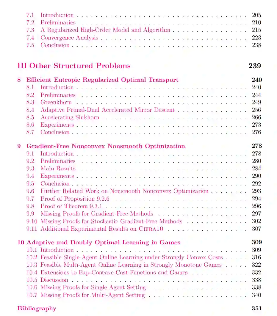 尽管这一研究方向已经被广泛研究了70多年并取得了广泛的成功,但机器学习的成功案例引入了新的表述,它们适合进行深入的理论分析和产生显著的实际影响。我的研究通过识别可靠机器学习(极小极大优化)和多智能体机器学习(高阶优化及以上)的特殊结构,以及设计计算适当定义的最优解的最优算法;还有其他结构化问题,如高效熵正则化最优传输、无梯度非光滑非凸优化以及在博弈中的自适应和双重最优学习,推动了这一领域的发展。