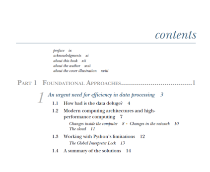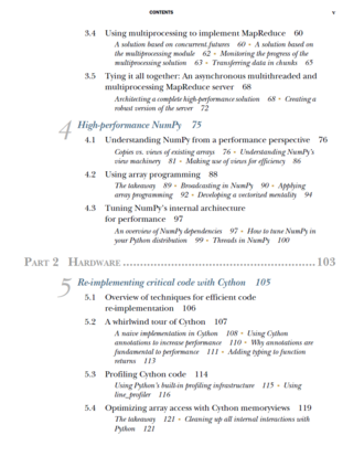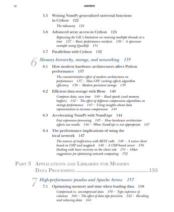 ■ 第6章讨论了现代硬件架构对设计高效Python代码的影响。考虑到现代计算机的设计方式,一些反直觉的编程方法可能比预期的更高效。例如,在某些情况下,处理压缩数据可能比处理未压缩数据更快,即使我们需要支付解压缩算法的代价。这一章还涵盖了CPU、内存、存储和网络对Python算法设计的影响。我们讨论NumExpr,一个可以通过使用现代硬件架构的属性使NumPy代码更高效的库。
