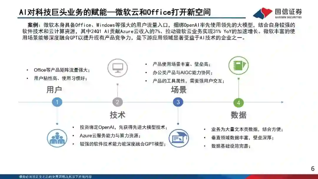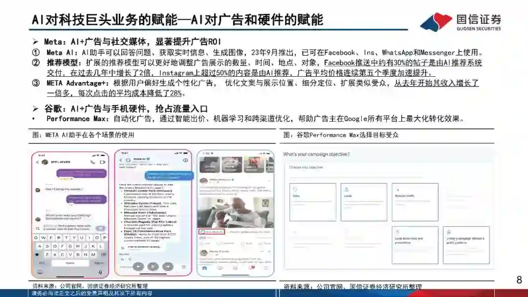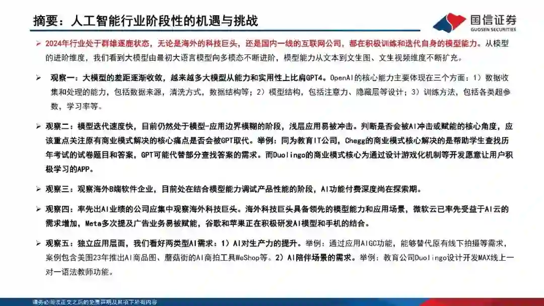 观察一:大模型的差距逐渐收敛,越来越多大模型从能力和实用性上比肩GPT4。OpenAI的核心能力主要体现在三个方面:1)数据收集和处理的能力,包括数据来源,清洗方式,数据结构等;2)模型结构,包括注意力、隐藏层等设计;3)训练方法,包括各类超参数,学习率等。 观察二:模型迭代速度快,目前仍然处于模型-应用边界模糊的阶段,浅层应用易被冲击。判断是否会被AI冲击或赋能的核心角度,应该重点关注原有商业模式解决的核心痛点是否会被GPT取代。举例:同为教育IT公司,Chegg的商业模式核心解决的是帮助学生查找历年考试的试卷题目和答案,GPT可能代替部分查找答案的需求。而Duolingo的商业模式核心为通过设计游戏化机制等开发愿意让用户积极学习的APP。 观察三:观察海外B端软件企业,目前处在结合模型能力调试产品性能的阶段,AI功能付费深度尚在探索期。 观察四:率先出AI业绩的公司应集中观察海外科技巨头。海外科技巨头具备领先的模型能力和应用场景,微软云已率先受益于AI云的需求增加,Meta多次提及广告业务易被赋能,谷歌和苹果正在积极研发AI模型和手机的结合。 观察五:独立应用层面,我们看好两类型AI需求:1)AI对生产力的提升。举例:通过应用AIGC功能,能够替代原有线下拍摄等需求,案例包含美图23年推出AI商品图、蘑菇街的AI商拍工具WeShop等。2)AI陪伴场景的需求。举例:教育公司Duolingo设计开发MAX线上一对一语法教师功能。