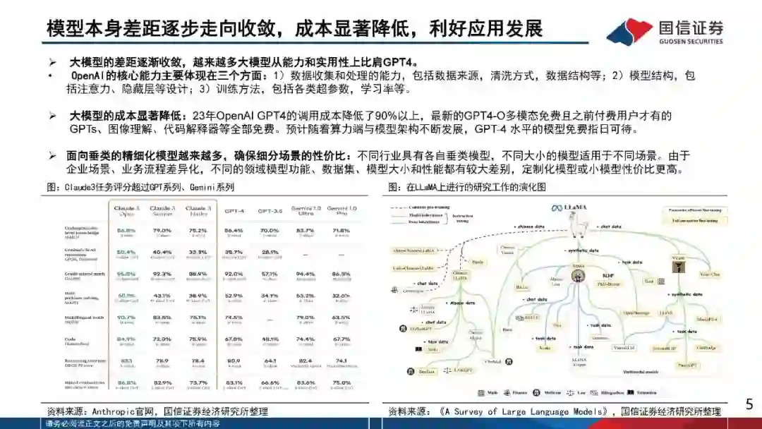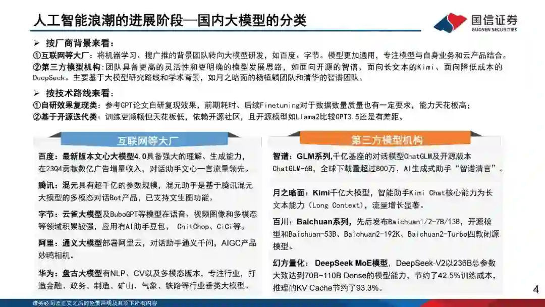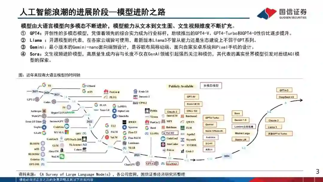 2024年行业处于群雄逐鹿状态,无论是海外的科技巨头,还是国内一线的互联网公司,都在积极训练和迭代自身的模型能力。从模型的进阶维度,我们看到大模型由最初大语言模型向多模态不断进阶,模型能力从文本到文生图、文生视频维度不断扩充。