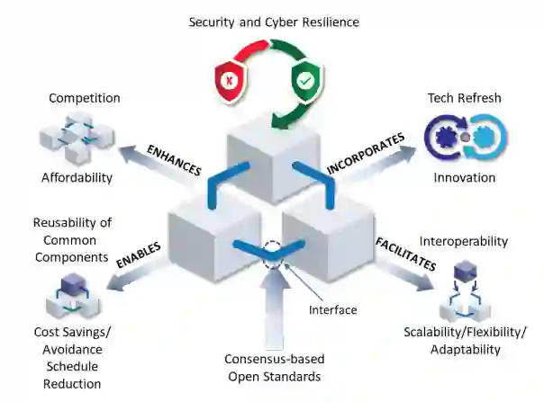 通用性是另一优势,MOSA鼓励跨系统采用通用组件与接口,增强一致性、缩短开发周期并简化训练维护。更少的定制部件还简化了后勤供应链。安全性与网络韧性通过共识性开放标准与模块化设计得以提升——安全补丁与更新可针对特定模块实施而不影响全系统。在需要强化作战安全性的场景下,政府管控接口可替代共识性开放标准。这些优势共同确保国防部系统具备适应性、竞争性与成本效益,最终支撑战备状态与作战优势。