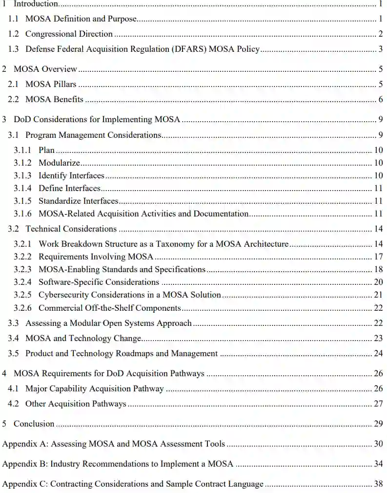 本指南提供了规划、实施与评估MOSA的最佳实践,包括实施原则、效益、挑战及基于国防部与工业界从业者经验的建议。其包含制定征求建议书(RFP)与评估MOSA实施规划方案时的参考建议。附录提供了补充信息,涵盖推动国防部MOSA领域认知的背景工作。