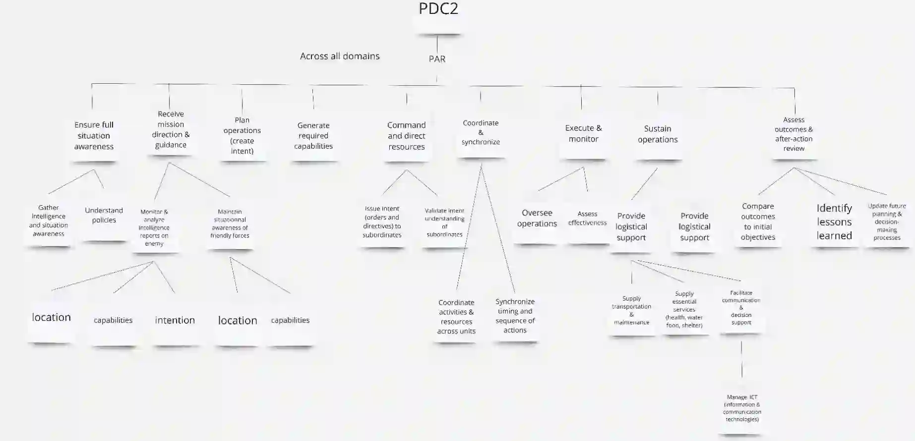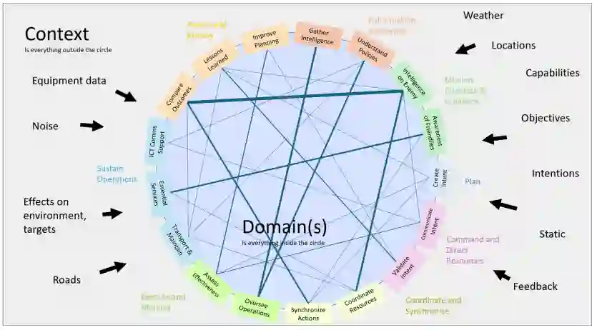 泛域指挥控制决策过程发生于日益动态复杂的环境中。现代作战域不仅涵盖传统的陆、海、空领域,还包括太空、网络与信息等数字时代新域。环境变化速度的加快要求指挥官创新适应方式以应对权限行使与任务意图执行中的情境变迁。本技术报告通过范围界定研究,梳理情境识别与感知的动态演变,并基于此提出指挥控制任务模型。报告分为三部分:第一部分综述情境感知与识别的文献成果,界定关键术语并概述技术前沿。情境识别被描述为将复杂环境表征为特征化图式、框架或模型的过程,明确这些抽象结构在数据、信息与能力层面对决策的作用。第二部分结合文献综述与加拿大军队指挥人员访谈,开展指挥控制任务分析,提出环形图任务模型,刻画任务域间多重同步影响(作为情境效应)及其作为情境识别的基础。第三部分提出未来研究方向,旨在深化情境识别理解,探索人工智能等数字技术辅助指挥官情境识别与决策的路径。