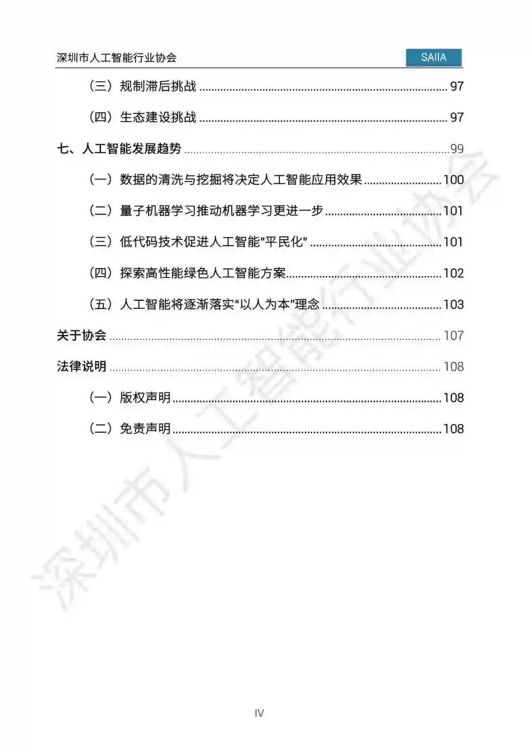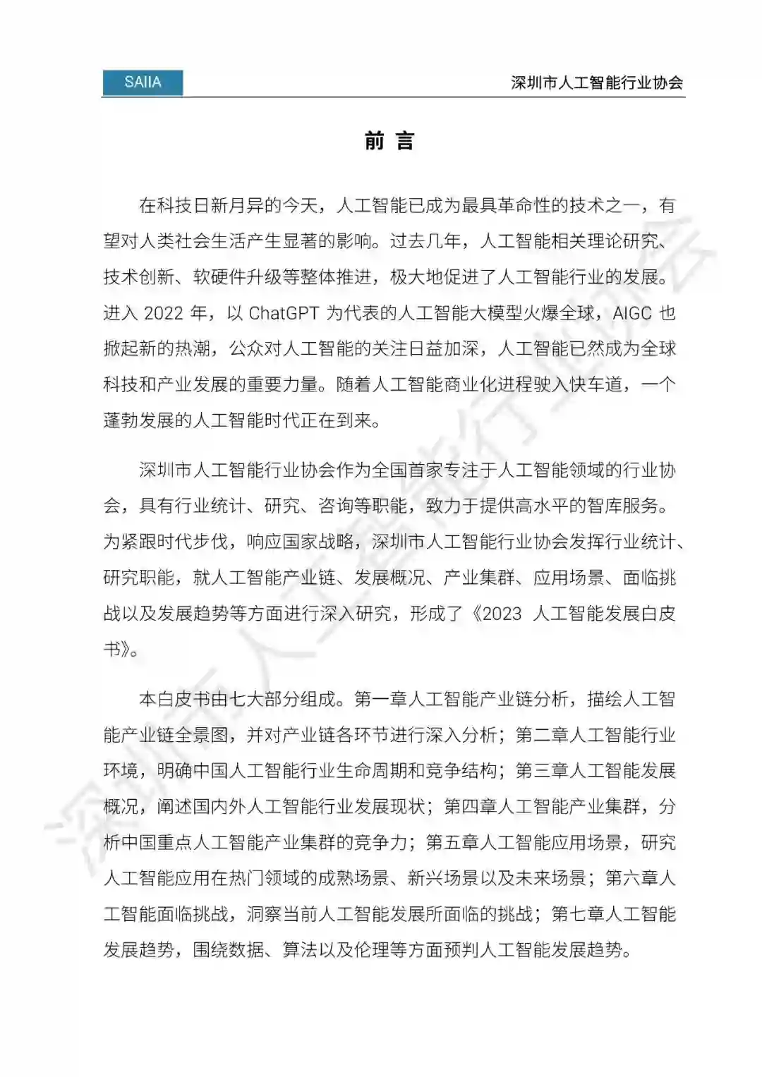 深圳市人工智能行业协会作为全国首家专注于人工智能领域的行业协会,具有行业统计、研究、咨询等职能,致力于提供高水平的智库服务。为紧跟时代步伐,响应国家战略,深圳市人工智能行业协会发挥行业统计、研究职能,就人工智能产业链、发展概况、产业集群、应用场景、面临挑战以及发展趋势等方面进行深入研究,形成了《2023人工智能发展白皮书》。