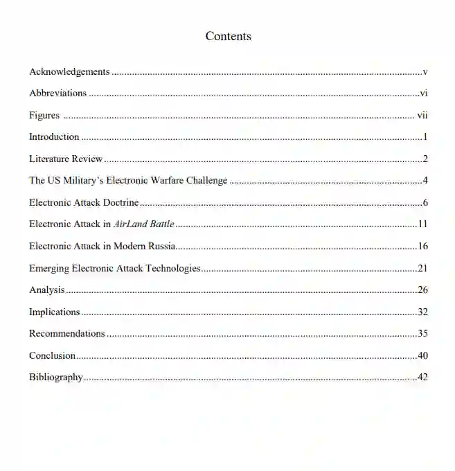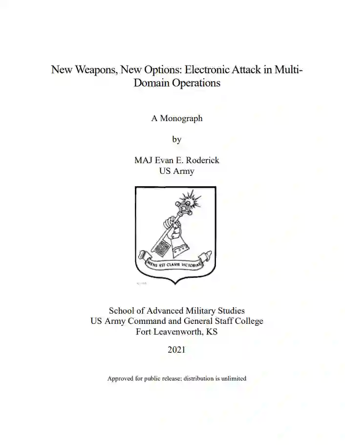 现代军队依靠电磁频谱来运作。因此,通过干扰和定向能量攻击电子和信息系统会降低现代对手的作战系统。冷战结束后,美国的对手在电子攻击能力方面进行了投资,而美国陆军则基本上放弃了自己的能力。意识到这一点,陆军现在正投资于新旧电子武器以缩小差距,在陆军试验多域作战概念时重新获得电子攻击能力。本专著的目的是回答这样一个问题:"美国陆军如何在MDO空间中利用电子攻击?" 本专著提出,陆军作战部队应将新兴的干扰和定向能武器整合到一个作战系统中,将物理、控制论和道德效应融合到对敌人的深度攻击中。这一建议对条令、组织和领导者的发展有重大影响。作者的意图是鼓励陆军领导人将环卫系统中的进攻行动视为当前和未来战场上联合武器作战的关键。