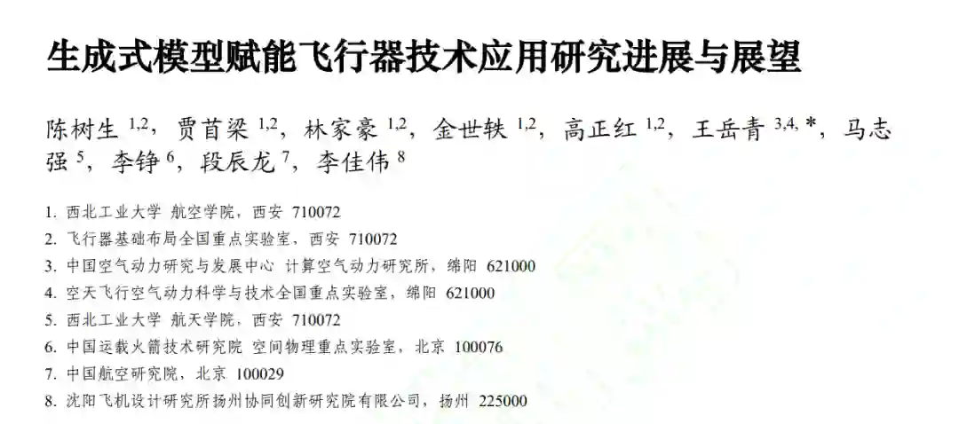 摘 要:在自然语言处理和计算机视觉领域取得颠覆性应用的生成式模型正成为数智化的新型技术基座,是未来驱动飞 行器技术智能化发展的重要引擎。本文综述了生成式模型赋能飞行器技术应用进展情况。首先,总结了生成式模型架构 的发展历程,详细介绍了变分自编码器、生成对抗网络、扩散模型、Transformer等基本原理架构和改进方向。其次,归 纳了生成式模型在飞行器空气动力学、航迹预测和目标检测等领域的典型应用和变革情况;关注了参数化建模、气动预 测模型、反设计等飞行器空气动力设计关键技术的发展趋势;探讨了实时航迹预测、完整航迹预测、协同航迹预测和预 测误差补偿的智能实现方法;从现有目标检测方法改进角度分析了生成式模型在多尺度融合、超分辨率增强和数据增强 中的作用。最后,从模型方法和应用场景拓展角度展望了生成式模型赋能智能飞行器技术未来的研究方向,针对构建可 解释的通用大模型和推动垂直领域应用等方面提出了发展建议。 关键词:生成式人工智能;飞行器技术;空气动力设计;航迹预测;目标检测