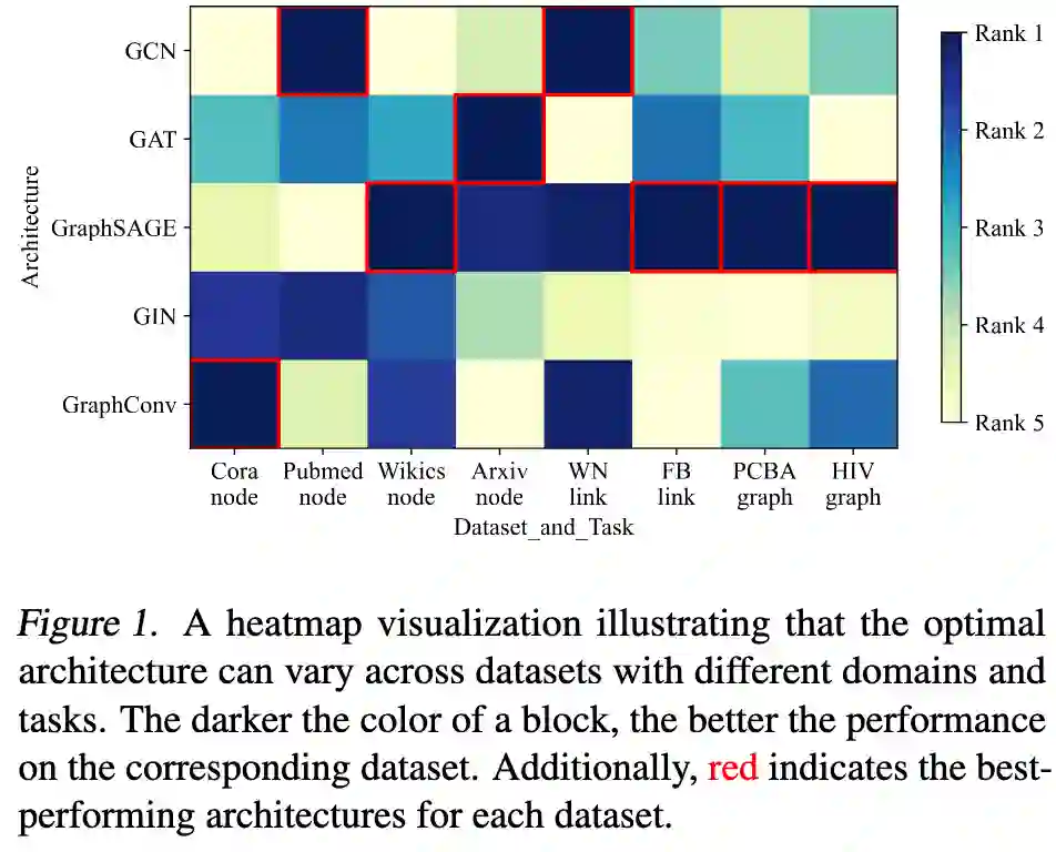 然而,现有的图基础模型普遍依赖人工设计且固定的GNN架构,缺乏对具体任务和领域的灵活适应能力,难以在多样化的图结构中实现最优性能。来自不同任务和领域的图数据在结构特征与分布模式上差异显著,往往需要差异化的图神经网络架构才能实现最优性能。为验证这一问题,团队首先在图基础模型框架下,对多种典型GNN架构(如 GCN、GAT 等)在多个任务与领域的数据集上进行了系统实验(结果如图1所示),发现不同任务和领域确实对应不同的最优架构。进一步地,以典型的可微分图神经网络架构搜索方法 DARTS 为例进行理论分析。结果表明,在存在架构不一致性的多任务图场景中,此类方法易产生架构搜索冲突,难以有效协调不同任务对架构的差异化需求,最终导致搜索结果次优,限制了模型的泛化能力。