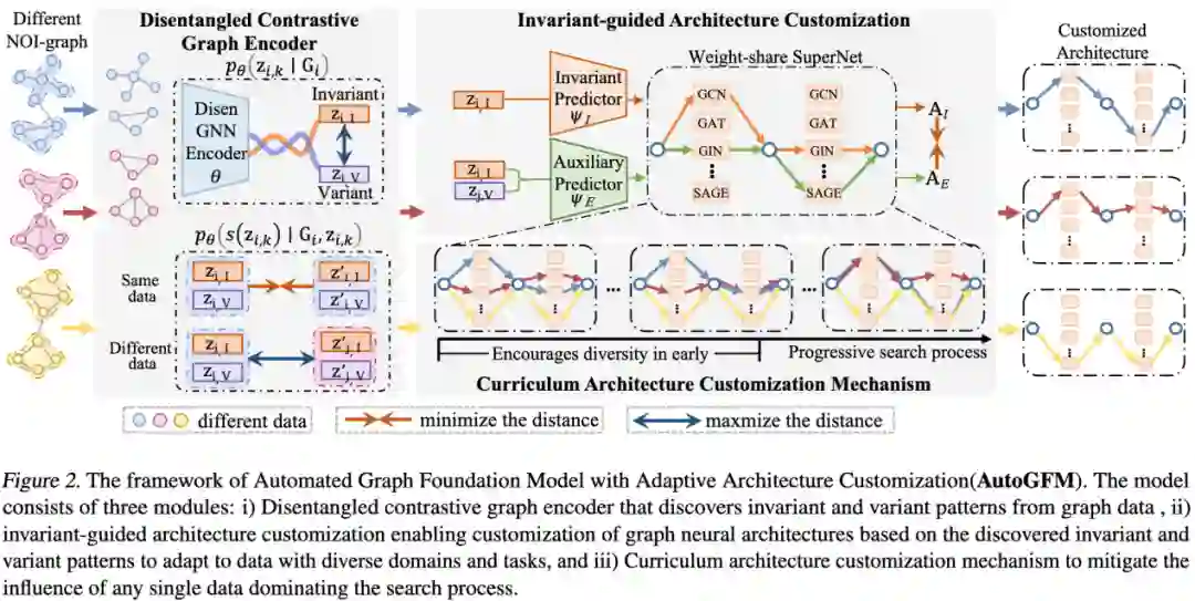 AutoGFM流程框图如图2所示。首先,AutoGFM提出了解耦对比图编码器,其中设计了一种子图级别的判别式对比学习方法,用于从多样的图数据中捕捉不变模式和变化模式。其次,AutoGFM提出了一种基于不变模式引导的架构定制方法,以便为多样化数据量身定制图神经网络架构。AutoGFM鼓励不变模式在面对变化模式干扰时仍保持定制架构的能力,旨在消除变化模式带来的影响。最后,AutoGFM提出了一种基于课程学习的架构定制约束,以缓解某些特定数据在搜索过程中主导架构搜索的现象。