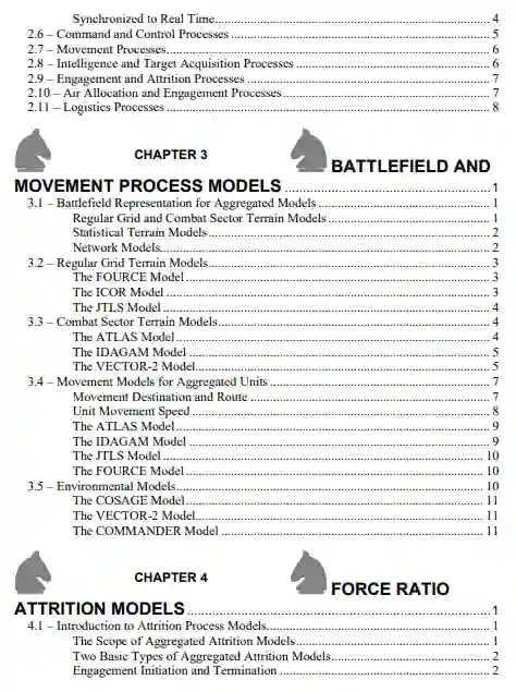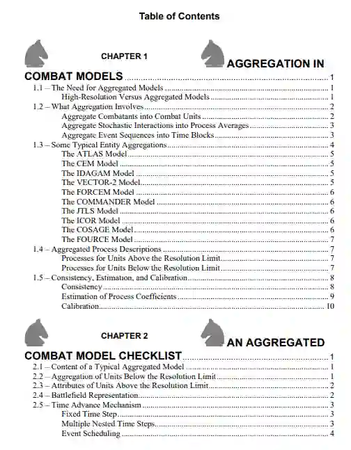 大规模作战仿真模型可为许多军事决策问题提供有用的见解。此类模型的设计者试图尽可能准确、可信地再现战争。对中等规模的部队来说,高分辨率建模有助于提高可信度,但对更大规模的部队来说,则需要对模型进行聚合,使其不超出计算机大小和执行时间的限制。第一章将集中讨论战斗模型中的聚合概念--它意味着什么、如何实现以及它对模型可信度的影响。