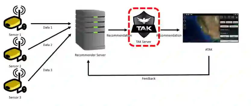 系统架构如图 1 所示。推荐服务器从部署的传感器接收数据,并通过 TAK 服务器将传感器推荐的信息对象发送给 ATAK。