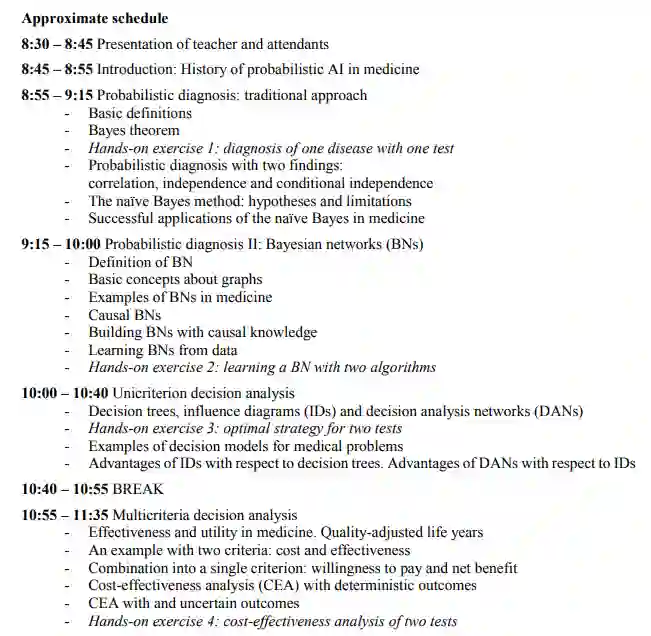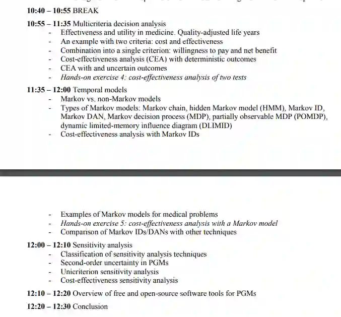 摘要: 概率图模型(PGMs)如贝叶斯网络、影响图、马尔可夫决策过程等,在医学领域的应用已有几十年的历史。本教程回顾了主要模型,提出了解决实际工作健康问题的新型模型和算法,包括时间推理和成本效益分析,并讨论了这些方法相对于卫生经济学中常用方法的优势,为PGMs开发了许多软件工具。
