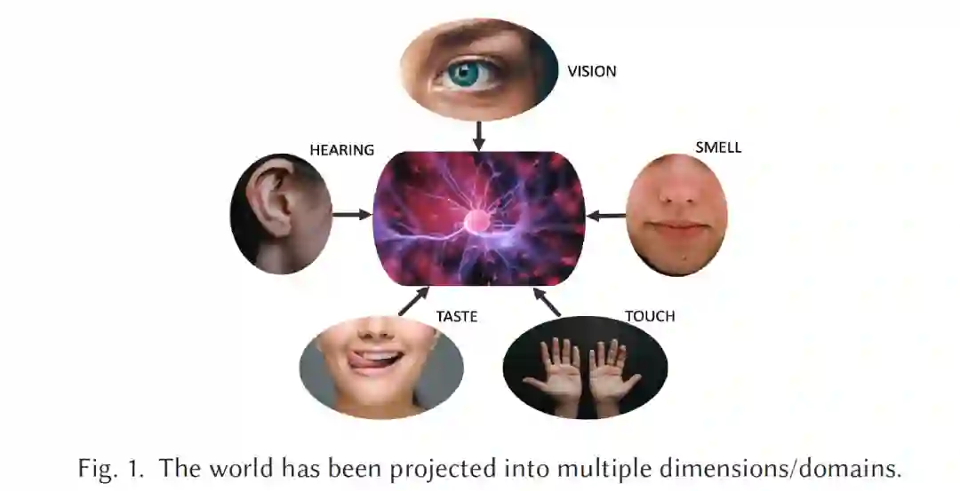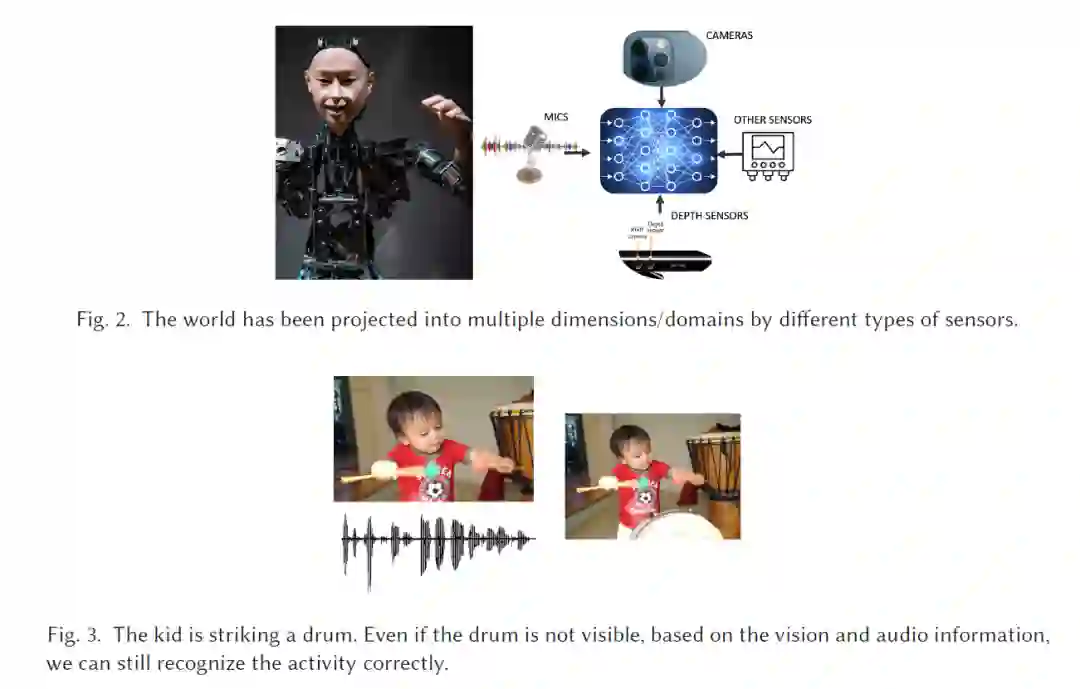 毫无疑问,数据在技术发展中是一个极为重要的催化剂,尤其是在人工智能(AI)领域。过去20年内生成的数据量约占全球所有数据的90%,并且数据增长的速度仍在加快。数据的爆炸式增长为AI的发展提供了前所未有的机会。随着传感器技术的进步,不仅数据的数量和质量得到了提升,数据的多样性也在迅速增长。来自不同传感器的数据为人们提供了同一对象、活动或现象的不同“视角”或“角度”。换句话说,人们可以通过使用不同的传感器来从不同的“维度”或“领域”观察同一对象、活动或现象。这些新的“视角”帮助人们更好地理解世界。例如,在100年前,医学领域由于观测器官方式的局限性,医生很难诊断患者是否患有肺部肿瘤。而在基于X射线技术的首台计算机断层扫描(CT)扫描仪发明后,从机器获取的数据为肺部提供了更丰富的信息,使医生能够仅基于CT图像做出诊断。随着技术的发展,磁共振成像(MRI),一种利用强磁场和射频波的医学成像技术,也被用于检测肿瘤。如今,医生可以访问包括CT、MRI和血液检测数据等多模态数据。这些数据的结合相比单一模态(如仅CT或仅MRI)能够显著提高诊断的准确性。这是因为CT、MRI和血液检测数据之间的互补和冗余信息能够帮助医生构建对观测对象、活动或现象的更全面的理解。AI的发展轨迹也类似。在早期,AI仅专注于使用单一模态解决问题。如今,AI工具已经变得越来越有能力通过多模态来解决实际问题。 什么是多模态?在现实中,当我们体验世界时,我们会看到物体,听到声音,感受到质感,闻到气味,尝到味道[^11]。世界通过不同媒介(如视觉、声音和质感)传达信息。图1显示了一个可视化示例。我们的感知器官如眼睛和耳朵帮助我们捕获这些信息。然后,我们的大脑能够融合来自不同感官的信息,以形成预测或决策。从每个源/媒介获得的信息可以被视为一种模态。当模态的数量超过一个时,我们称之为多模态。然而,与眼睛和耳朵不同,机器主要依赖于传感器,例如RGB摄像头、麦克风或其他类型的传感器,如图2所示。每个传感器都可以将观测到的对象/活动映射到其自身的维度。换句话说,观测到的对象/活动可以投射到每个传感器的维度中。然后,机器或机器人可以收集来自每个传感器的数据,并基于这些数据做出预测或决策。在工业中,有许多应用利用了多模态。例如,自2020年代以来,自动驾驶汽车成为热门话题,是一个典型的依赖多模态的应用。这样的系统需要来自不同传感器的多种数据,如LiDAR传感器、雷达传感器、摄像头和GPS。模型将融合这些数据以进行实时预测。在医学领域,越来越多的应用依赖于医学成像与电子健康记录的融合,使模型能够在临床背景下分析成像结果,如CT和MRI的融合。 为什么我们需要多模态?一般而言,多模态数据指的是从不同传感器收集的数据,例如癌症诊断中的CT图像、MRI图像和血液检测数据,自动驾驶系统中的RGB数据和LiDAR数据,Kinect中的RGB数据和红外数据用于骨骼检测[^28]。对于同一个观察对象或活动,不同模态的数据可以有不同的表达方式和视角。尽管这些数据的特性可能独立且不同,它们在语义上往往重叠。这种现象称为信息冗余。此外,不同模态的信息可以具有互补性。人类可以无意识地融合多模态数据,获取知识并做出预测。从多模态中提取的互补和冗余信息可以帮助人类形成对世界的全面理解。如图3所示的示例中,当一个孩子在打鼓时,即使我们看不到鼓,仍然能够通过声音识别出正在敲击的鼓。在这个过程中,我们无意识地融合了视觉和听觉数据,并提取了它们的互补信息,以做出正确的预测。如果只有一种模态可用,例如鼓对象不在视线范围内的视觉模态,我们只能看出一个孩子正在挥动两根鼓棒。仅有声音时,我们只能判断出有鼓被敲击,而无法知道是谁在敲鼓。因此,基于单一模态的独立解释仅呈现观察活动的部分信息,而基于多模态的解释可以传达更完整的“全貌”,比单模态模型更稳健和可靠。例如,自动驾驶汽车包含多种传感器,如RGB摄像头和LiDAR传感器,在能见度接近零的极端天气条件下(如浓雾或暴雨)需要检测路上的物体。多模态模型在这种情况下仍然能够检测到物体,而仅依赖视觉的模型则可能无法做到。然而,机器要理解并利用多模态数据的互补特性来提高预测/分类准确性仍然是非常困难的。