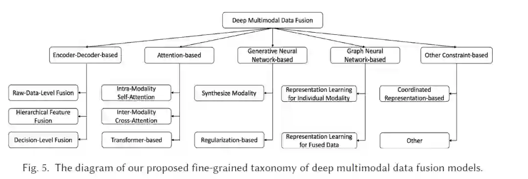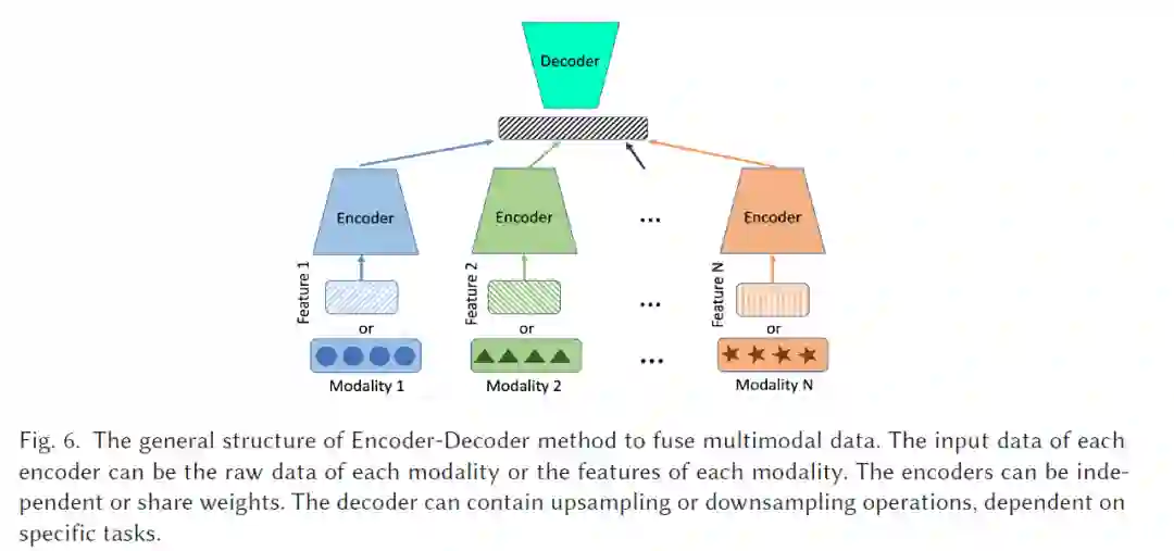 本文的其余部分组织如下:第二部分介绍基于编码器-解码器的融合方法,其中将方法分为三个子类。第三部分展示多模态数据融合中使用的最先进注意力机制,并在本节介绍大型预训练模型。第四部分介绍基于GNN的方法。第五部分介绍基于GenNN的方法,并展示了GenNN在多模态任务中的两个主要作用。第六部分展示在最先进的深度多模态模型中采用的其他约束方法,例如基于张量的融合。第七部分将介绍多模态数据融合中的主要任务、应用和数据集。第八部分和第九部分讨论了多模态数据融合的未来方向和本综述的结论。