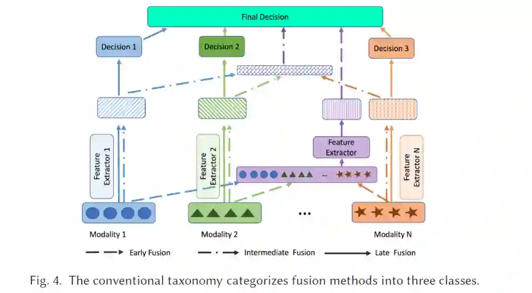 自2010年以来,多模态数据融合全面进入了深度学习阶段。基于深度学习的多模态数据融合方法在各类应用中展现出卓越的成果。对于基于视频-音频的多模态数据融合,文献[35, 37, 51, 163]通过深度学习技术(如卷积神经网络、长短期记忆网络(LSTM)、注意力机制等)解决情感识别问题。此外,在视频-文本多模态数据融合方面,文献[41, 56, 68, 107, 123, 124, 195]利用Transformer、BERT、注意力机制、对抗学习及其组合来解决文本到视频的检索任务。其他多模态任务还有许多,例如视觉问答(VQA)(文本-图像:[154, 220],文本-视频:[82, 223])、RGB-深度对象分割[31, 39]、医学数据分析[181, 185]和图像描述生成[216, 237]。相比传统的ML方法,如果训练数据量足够大,基于深度神经网络(DNN)的方法在表示学习和模态融合方面表现出色。此外,DNN能够自动执行特征工程,这意味着可以从数据中自动学习分层表示,而无需手工设计或手工制作模态特定的特征。传统上,多模态数据融合的方法依据传统融合分类法分为四类,如图4所示,包括早期融合、中期融合、后期融合和混合融合:(1) 早期融合:来自每个模态的原始数据或预处理数据在送入模型之前融合;(2) 中期融合:从不同模态提取的特征融合后送入模型进行决策;(3) 后期融合(也称为“决策融合”):将从每个模态获得的独立决策融合成最终预测,例如多数投票或加权平均,或在独立决策之上引入一个元ML模型;(4) 混合融合:结合早期、中期和后期融合。随着可用的多模态数据量的大幅增加,对更先进的融合方法(与手工挑选的融合方式相对)的需求也空前增长。然而,这种传统的融合分类法仅能为多模态数据融合提供基本指导。为了从多模态数据中提取更丰富的表示,DNN的架构变得越来越复杂,不再单独、独立地从每种模态中提取特征。相反,表示学习、模态融合和决策过程在大多数情况下是交织在一起的。因此,不再需要在网络的哪个部分具体指定多模态数据融合的发生位置。多模态数据的融合方式已从传统的显式方式(如早期融合、中期融合、后期融合)转变为更隐式的方式。为了迫使DNN学习如何提取多模态数据的互补性和冗余性,研究人员在DNN上设计了各种约束,包括特定的网络架构设计和损失函数的正则化等。因此,深度学习的发展显著重塑了多模态数据融合的格局,揭示了传统融合方法分类的不充分性。深度学习架构的固有复杂性往往将表示学习、模态融合和决策过程交织在一起,打破了过去的简化分类。此外,以注意力机制为代表的从显式到更隐式的融合方式挑战了传统融合策略的静态特性。图神经网络(GNN)和生成神经网络(GenNN)等技术引入了处理和融合数据的新方法,这些方法并不符合早期到后期融合的框架。此外,深度模型的动态和自适应融合能力,以及大规模数据带来的挑战,要求比传统类别更为复杂的融合方法。鉴于这些复杂性和快速演变,迫切需要引入一种更深入的分类法,以捕捉当代融合方法的细微差别。 关于多模态数据融合,目前科学界有几篇最新的综述。Gao等[46]提供了一篇关于多模态神经网络和前沿架构的综述,但该综述仅关注于一个狭窄的研究领域:用于RGB-深度图像的对象识别任务。此外,该综述仅限于卷积神经网络。Zhang等[235]提出了一篇关于深度多模态融合的综述,作者使用传统分类法对模型进行分类:早期融合、后期融合和混合融合。此外,该综述仅关注于图像分割任务。Abdu等[2]提供了一篇关于使用深度学习方法进行多模态情感分析的文献综述,将深度学习方法分为三类:早期融合、后期融合和基于时间的融合。然而,和上述综述类似,这篇综述也仅聚焦于情感分析。Gao等[45]提供了一篇关于多模态数据融合的综述,介绍了深度学习的基本概念及多模态深度模型的几种架构,包括基于堆叠自编码器的方法、基于循环神经网络的方法、基于卷积神经网络的方法等。然而,该综述未涵盖前沿的大型预训练模型和基于GNN的方法,例如BERT模型。Meng等[121]提出了一篇关于ML用于数据融合的综述,重点介绍了传统ML技术而非深度学习技术。此外,作者将方法分为信号级融合、特征级融合和决策级融合三类,这种分类方式与传统的早期融合、中期融合和后期融合分类相似,对社区来说并不新鲜。还有其他几篇综述[4, 128, 227]在多模态领域,但大多数都聚焦于特定的模态组合,例如RGB-深度图像。