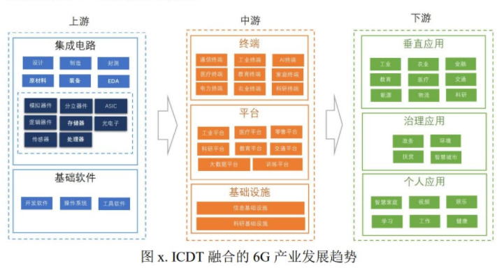 ICDT融合的6G技术必然来带ICDT融合产业形态,形成以集成电路、基础软硬件为上游,以信息处理基础设施、能力平台和终端为中游,升级的2C、2B和2G应用为下游的产业新格局。为了6G更好的发展,本文建议加快6G创新链与产业链融合发展,培养6G高端人才体系,形成创新与产业集群效应,解决6G发展面临的理论、器件和芯片等瓶颈问题。