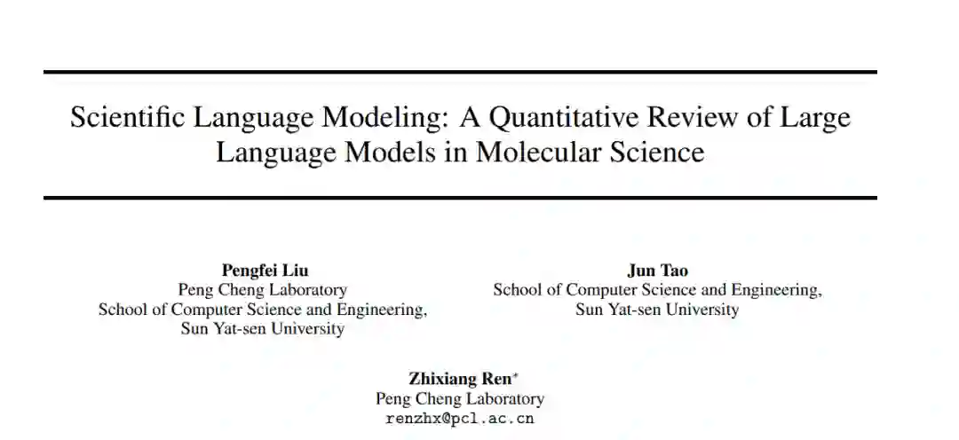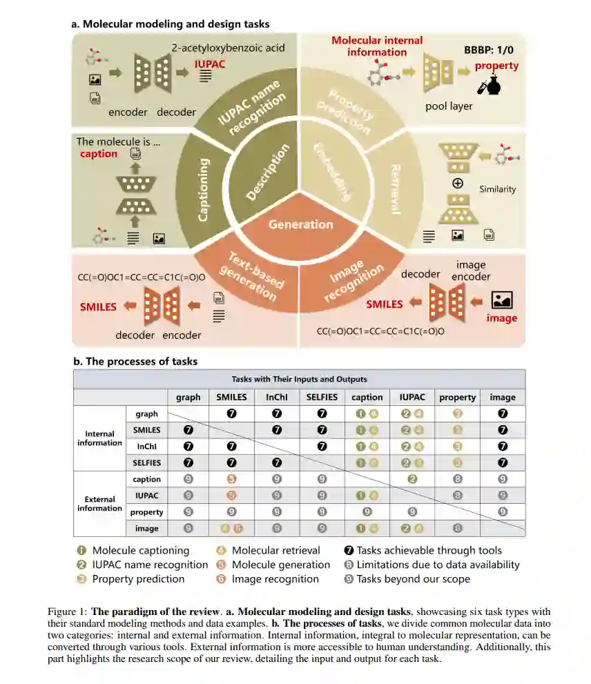 高效的分子建模和设计对于新分子的发现和探索至关重要,深度学习方法的引入已经彻底改革了这一领域。特别是,大型语言模型(LLMs)提供了一种全新的方法来从自然语言处理(NLP)的角度解决科学问题,引入了一种称为科学语言建模(SLM)的研究范式。然而,仍有两个关键问题:如何量化模型与数据模态之间的匹配度以及如何识别模型的知识学习偏好。为了应对这些挑战,我们提出了一个多模态基准,命名为ChEBI-20-MM,并进行了1263次实验来评估模型与数据模态和知识获取的兼容性。通过模态转换概率矩阵,我们提供了关于任务最适合的模态的见解。此外,我们引入了一种统计上可解释的方法,通过局部特征过滤发现特定上下文的知识映射。我们的先驱性分析提供了对学习机制的探索,并为推进分子科学中的SLM铺平了道路。 Transformers[8]以其强大的文本编码和生成能力提供了优势。这些模型可以通过最小的任务特定调整进行微调,使它们在分子建模和设计中更加多才多艺和高效。此外,自从ChatGPT[9]和GPT-4[10]的出现以来,大型语言模型(LLMs)已成为尤其在分子科学中的一种突破性趋势。LLMs凭借其在处理和生成类人文本的先进能力,提出了一个理解和设计分子结构的新范式。它们吸收和分析大量文本数据的能力可以提供前所未有的洞察,克服了传统AI方法的一些限制。这种新能力结合了准确性和新颖性,以改善结果,被称为化学知识。其有效性取决于输入数据、模型架构和训练策略等因素。然而,对这一能力的当前综述和基准评估并不全面。 分子科学中现有的综述,如分子生成综述[11],通常缺乏全面的模型比较,并且任务范围有限。知识驱动的综述[12]对分子学习进行了分类,但缺少详细的方法比较和数据集讨论。而最近的基准测试,如测试ChatGPT的[13],涵盖了八个化学任务,每个任务都提供了独特的化学洞察。Mol-Instructions[14]提供了一个用于微调的数据集,包含各种分子和蛋白质指令,增强了LLMs中的生物分子理解。然而,这些综述和基准测试缺乏多模态内容,也没有充分探索模型的化学知识。 总结来说,本研究全面回顾了Transformers和LLMs在分子建模与设计中的应用。我们将六个常见的分子任务分类为三个不同的目标:描述、嵌入和生成,如图1所生动描绘。此外,我们建立了一个统一的多模态基准ChEBI-20-MM,并进行实验评估数据模态、模型架构和不同任务类型的兼容性,考察它们对任务性能的影响。此外,我们的端到端可视化方法展示了嵌入化学知识的建模洞察的发现。总体来说,我们的主要贡献包括: • 本工作分析了LLMs在分子建模中的应用,分类现有模型,并提出了一个多模态基准(ChEBI-20-MM)进行性能评估,支持1263次实验。 • 我们分析了模态转换概率矩阵,并确定了不同数据模态和模型架构之间的最佳匹配。 • 我们引入了一种统计上可解释的方法,通过局部特征过滤展示了知识获取。 本文的其余部分如下组织。第2节介绍相关定义和背景。然后,我们探讨分子建模和设计中的六个关键任务。第3节展示了我们的基准测试和洞察。第4节讨论了关键结果和限制,第5节总结了我们的贡献和未来研究方向。