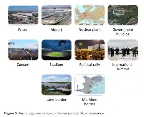 本文章节安排如下:为厘清问题本质,第3章解析无人机系统(UAS)关联事故案例并评估现役反无人机能力缺口;第4章探究当前反无人机作战的技术与方法体系,深化现状认知。基于前述研究基础,第5章提出10项标准化反无人机应用场景,该场景框架将作为全流程标准化工作的指导准则。第6章详述各标准场景的风险分析流程。通过平行工作路径并结合终端用户研讨,第7章提出反无人机覆盖的作战需求体系,同步制定系列系统性能要求与量化指标。综合上述成果,第8章构建反无人机系统评估方法论。该方案在希腊、比利时及西班牙开展的三次大规模试验中完成验证(详见第9章)。第10章作为总结,通过实证结果研讨指出现存研究缺口,并规划未来研究方向。
