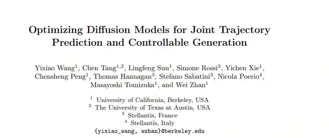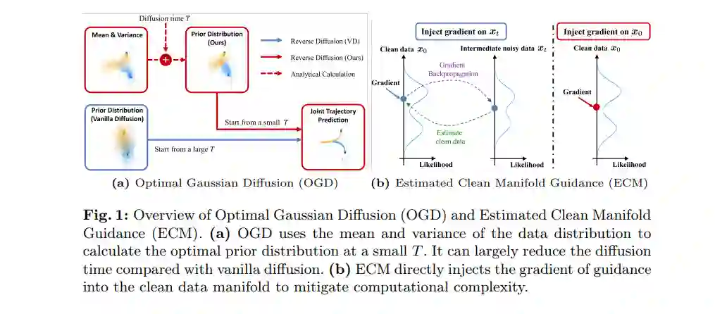 扩散模型在自动驾驶的联合轨迹预测和可控生成方面展现出了潜力,但它们面临着推理步骤效率低下和计算需求高的挑战。为了应对这些挑战,我们引入了最优高斯扩散(OGD)和估计清洁流形(ECM)引导。OGD优化了小扩散时间T的先验分布,并从此开始逆向扩散过程。ECM直接向估计的清洁流形注入引导梯度,消除了整个网络中广泛的梯度反向传播。我们的方法简化了生成过程,使实际应用能够减少计算开销。在大规模的Argoverse 2数据集上进行的实验验证表明,我们的方法性能卓越,为自动驾驶的计算效率高、质量高的联合轨迹预测和可控生成提供了一个可行的解决方案。我们的项目网页位于 https://yixiaowang7.github.io/OptTrajDiff_Page/ 关键词:扩散模型、自动驾驶、轨迹预测、可控轨迹生成。