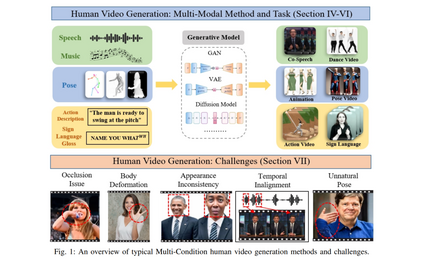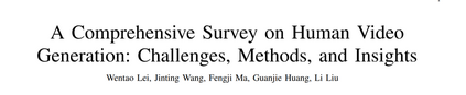 最近,人类视频生成在生成方法的进展中取得了快速进步,即变分自编码器(VAE)、生成对抗网络(GAN)和扩散模型。然而,研究这样的视频合成问题被认为具有挑战性,主要有以下原因。首先,沿时间序列保持人类外观一致性是该任务中的一大障碍。其次,在合成视频中,避免人体变形是困难的,例如手指异常。第三,人类运动视频的复杂性不仅仅是面部建模,还涉及准确建模身体运动以及保持背景与身体部位的一致性和和谐。此外,人类运动生成的需求通常包括上下文作为条件,如文本描述、音频信号和姿态序列,确保与这些条件信号的时间对齐对于生成连贯且逼真的人类视频至关重要。