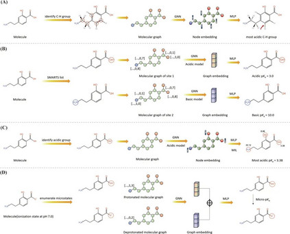 基于描述符的模型以专家提取的固定维特征向量作为输入。相比之下,基于图的模型直接作用于由基本原子和键属性注释的分子图。这篇综述概述了基于ML的小分子pKa预测的最新进展,总结了计算预测工具,并讨论了当前的挑战和未来的方向。