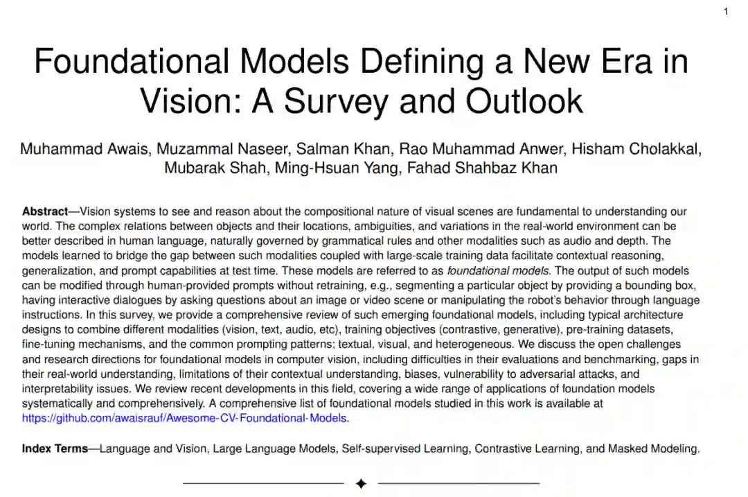 视觉系统看到并理解视觉场景的组合性质对于理解我们的世界至关重要。在真实世界的环境中,物体与其位置之间的复杂关系、模糊性和变化可以更好地用受到语法规则和其他模态(如音频和深度)制约的人类语言来描述。 模型学习如何弥合这些模态之间的差距,并结合大规模训练数据,促进了上下文推理、泛化和测试时的即时能力。这些模型被称为基础模型。这种模型的输出可以通过人提供的提示进行修改,而无需重新训练,例如,通过提供一个边界框来分割特定的物体,通过询问关于图像或视频场景的问题进行交互式对话,或通过语言指令操纵机器人的行为。 在这次调查中,我们提供了这些新兴基础模型的全面回顾,包括结合不同模态(视觉、文本、音频等)的典型架构设计、训练目标(对比性、生成性)、预训练数据集、微调机制,以及常见的提示模式:文本、视觉和异质性。 我们讨论了计算机视觉中基础模型的开放性挑战和研究方向,包括它们的评估和基准测试困难、对真实世界理解的差距、上下文理解的局限性、偏见、对对抗性攻击的脆弱性和解释性问题。我们回顾了这一领域的最新发展,全面系统地涵盖了基础模型的广泛应用。本工作研究的基础模型的全面列表可以在