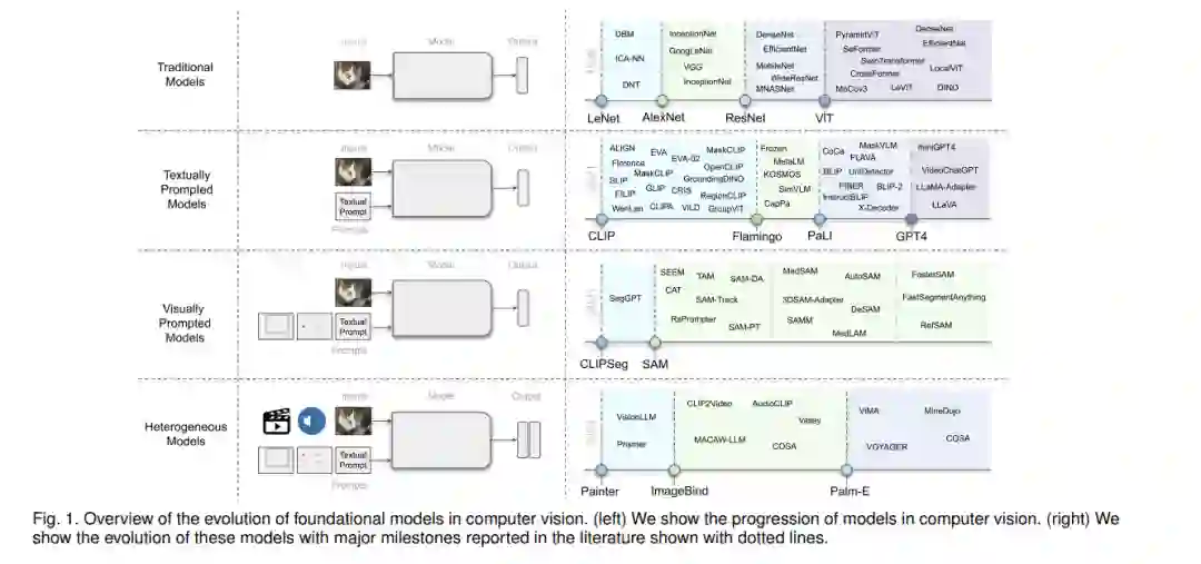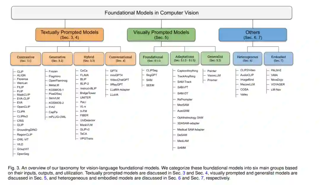 在这项工作中,我们系统地回顾了计算机视觉中的基础模型。首先,我们简要介绍了基础模型的背景和初步内容,简要涵盖了常见的架构类型、自监督学习目标、大规模训练和提示工程(第2节)。然后,我们将现有的工作区分为基于文本的提示(第3-4节)、基于视觉的提示(第5节)、基于异构模态(第6节)和基于具体实体的基础模型(第7节)。在基于文本提示的基础模型中,我们进一步将它们区分为对比、生成、混合(对比和生成)以及会话型VL模型。最后,我们根据我们的分析讨论了开放的挑战和研究方向(第8节)。接下来,我们回顾了与我们相关的其他调查,并讨论了它们的差异和独特之处。