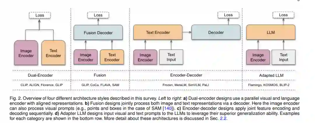 除了大型的视觉-语言基础模型,还有一些研究努力致力于开发可以由视觉输入提示的大型基础模型。例如,最近推出的SAM [140]可以执行与类别无关的分割,给定一个图像和一个视觉提示,如盒子、点或遮罩,这指定了在图像中要分割的内容。这样的模型在数十亿的物体遮罩上进行训练,遵循模型在循环中的数据集注释设置(半自动化)。进一步说,这种基于通用视觉提示的分割模型可以被适应于特定的下游任务,如医学图像分割[189, 292]、视频物体分割[316]、机器人学[303]和遥感[35]。除了基于文本和视觉提示的基础模型,研究工作还探索了开发模型,努力对齐多个配对的模态(例如,图像-文本、视频-音频或图像-深度),以学习对不同下游任务有帮助的有意义的表示[92, 102, 188]。