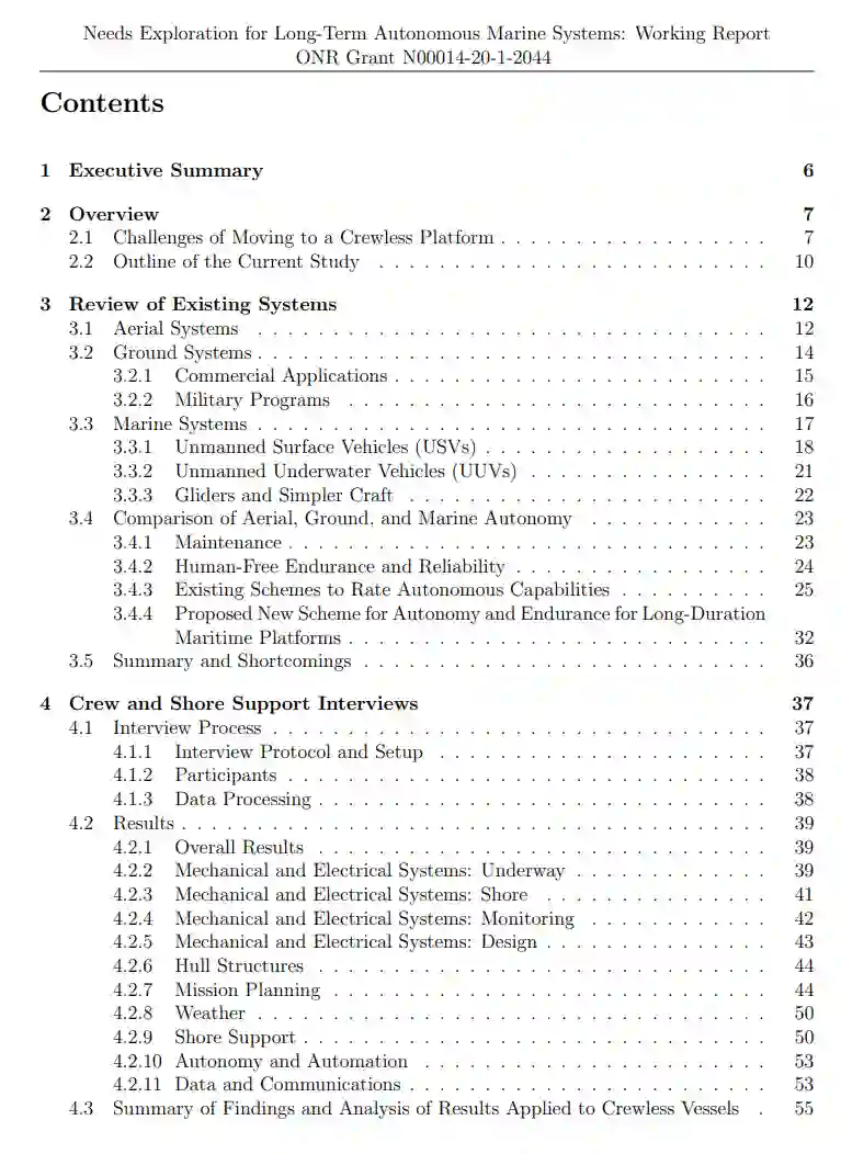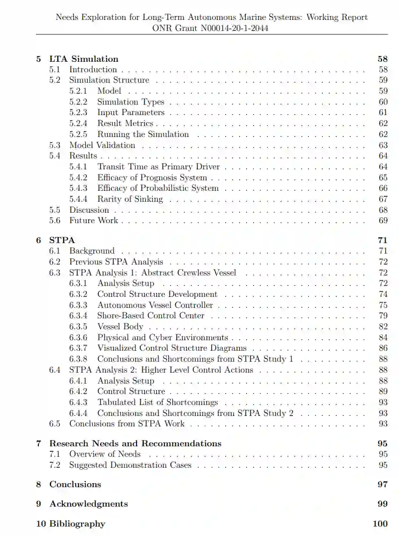 最后,一个修改过的STPA方法被用来尝试探索长期规划系统的重大风险领域。比较了两种STPA公式,更狭隘地专注于任务规划的方法能够确定现有算法可能不足的广泛领域。构建了一个由此产生的挑战领域的表格,并提出了三个开发案例研究来解决表格中的差距。这些案例被设计成对基础研究的探索是可行的,但涉及足够多的学科,以广泛代表海上任务规划问题。这三个案例研究包括一个燃料管理研究,一个机械设计和支持案例,以及一个可适应的风险水平案例。报告最后提出了实施这些案例研究的建议,以及进一步的工作。