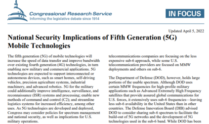 为了应对这些安全问题,美国国会通过了《安全5G及其他法案》(P.L. 116-129),要求总统制定5G保护战略。同样,2020财年国防授权法(NDAA)(P.L. 116-92)第254条要求国防部长制定国防部5G战略。这些战略分别于2020年3月和2020年5月发布。美国防部在2020年12月发布了一个5G实施计划,详细说明了目前的活动以及它们如何与战略保持一致。此外,2021财年NDAA(P.L. 116-283)第224条指示国防部创建一个5G治理结构,而第225条指示国防部展示5G组件技术的成熟度。最后,2022财年NDAA(P.L. 117-81)第233条指示每个军事部门的部长制定一个军事设施的5G试点计划。
