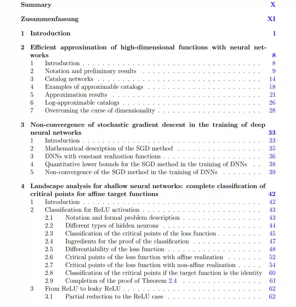 神经网络因其在各种应用中的出色表现而受到了广泛的关注。两个方面特别引人注目:一方面,神经网络似乎比传统方法具有更优越的逼近能力。另一方面,尽管训练任务是一个高度非凸的优化问题,神经网络仍然可以成功地通过基于梯度的算法进行训练。本文推进了这两种现象背后的理论。在逼近的方面,我们开发了一个框架,证明神经网络可以打破所谓的维度诅咒,在不同的高维逼近问题中,涉及的神经网络的复杂性最多以维度的多项式增长。我们的方法基于目录网络的概念,它是前馈神经网络的一种推广,在其中非线性激活函数可以在各层之间变化,只要它们是从预定义的函数目录中选择的。因此,目录网络构成了连续函数的丰富家族。我们证明,在目录的适当条件下,这些目录网络可以有效地用整流线性单元(ReLU)类型的网络进行逼近,并提供了给定逼近精度所需参数数量的精确估计。作为一般结果的特例,我们得到了可以在没有维度诅咒的情况下用ReLU网络逼近的不同类别的函数。在优化的方面,我们通过研究损失表面,探讨了神经网络和基于梯度的训练算法之间的相互作用。一方面,我们发现由于网络结构和算法初始化之间不幸的相互作用,成功的学习受到了阻碍。更准确地说,我们展示了,如果ReLU网络的深度远大于其宽度,且随机初始化的数量不足够快速增加到无穷大,那么随机梯度下降法将无法收敛。另一方面,我们通过进行景观分析和应用动态系统理论,建立了积极的结果。这些积极的结果处理了具有一个隐藏层和ReLU、漏ReLU或二次激活的神经网络的真实损失的景观。在所有三种情况下,我们在目标函数是仿射和一维的情况下,提供了关键点的完全分类。接下来,我们证明了动态系统结果的新变体,一个中心稳定流形定理,其中我们放宽了通常施加的一些规律性要求。我们验证了具有一个隐藏层的ReLU网络适应这个新框架。在我们的关键点分类的基础上,我们推断出梯度下降避开了大部分鞍点。我们进一步证明,如果初始化足够好,就能收敛到全局最小值,这通过限制损失的明确阈值来表达。