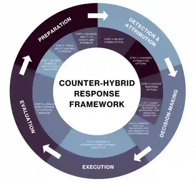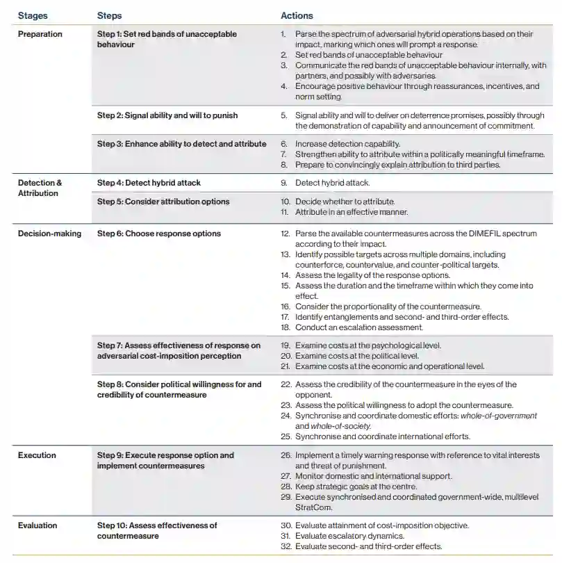准备阶段涉及阐明核心利益,并向对手传达不可接受行为的红线。此外,还需要建立和加强发现混合攻击的能力,以及将其归咎于混合攻击的政治意愿。