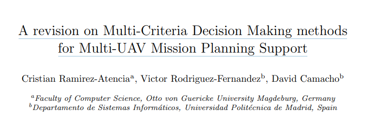 为了执行复杂的协调任务,规划系统需要更高效的问题解决能力,以应对空间和时间领域的目标冲突和严格限制。此外,这些问题通常旨在优化多个相互冲突的目标,包括燃料消耗、时间跨度、任务成本、使用的无人机数量以及可能危及任务的不同风险因素等。因此,所谓的多无人机合作任务规划问题(MCMPP)最近在研究界获得了强劲的发展势头,其推动力是在不久的将来,无人机的应用规模和数量将显著增加(Ramirez-Atencia 等人,2017b)。