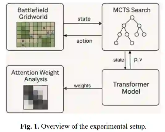 在复杂环境中能够进行复杂策略决策的自主智能体的开发是人工智能的核心目标。本文提出了一个在模拟网格世界战场环境中发现和解释策略的框架。我们利用AlphaZero算法——一种将蒙特卡洛树搜索与深度神经网络相结合的强大强化学习方法——来训练智能体。关键在于,该神经网络组件采用了Transformer架构。这项工作的主要贡献在于所提出的方法:利用Transformer内部的自注意力机制来深入理解智能体的决策过程,具体而言,通过可视化展示网络在选择行动时关注战场的哪些区域。该方法不仅旨在开发高性能的智能体,同时也致力于增强其学习所得策略的可解释性。