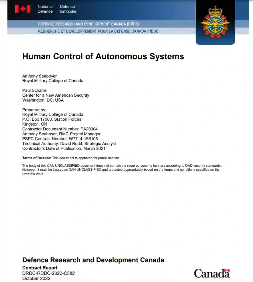 本研究报告分析了当前利益相关者对军事自主系统的人为输入或控制的想法。作者首先定义了关键术语,如 "机器学习"、"自主系统"、"人在回路中"以及军事背景下的 "有意义的人为控制",然后讨论了当代利益相关者的文献对无人驾驶军事系统的人的输入/控制的说明。然后,报告讨论了各利益攸关方是否对进攻性和防御性系统中所需要或期望的人类控制水平达成了共识,以及是否因系统具有致命性和非致命性能力或西方和非西方国家之间的意见不同而有所不同。报告最后从政策和操作的角度阐述了利益相关者的想法对加拿大国防部/空军的可能影响。