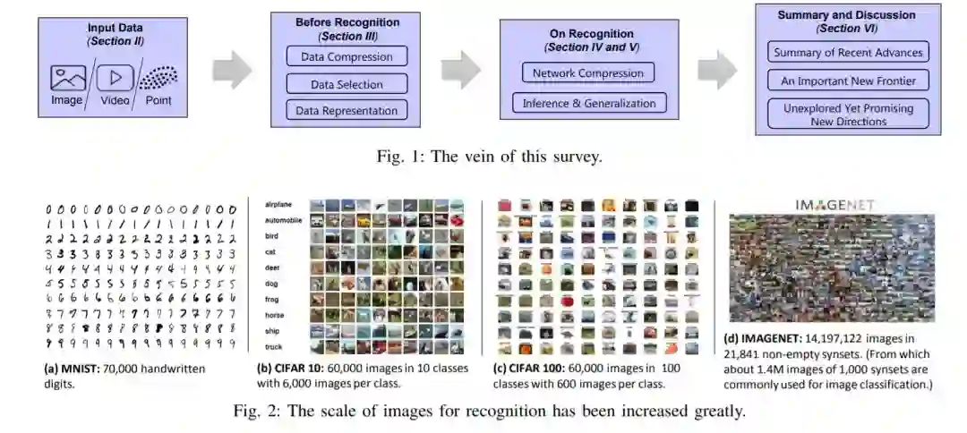 相比之下,本综述主要关注从原始视觉数据到最终识别结果的生产全局效率,希望能帮助对现代视觉识别任务及其高效的基于DNN的解决方案感兴趣的读者。这篇论文在以下几个方面也有我们所知的创新之处。1)系统地综述了神经网络在视觉识别领域的研究进展,这是我们所知的同类研究的首次。2)第一次总结了有效视觉识别的数据相关问题,包括数据压缩、数据选择和数据表示。3)从有利于视觉识别任务的角度研究网络压缩模型。4)在高效视觉识别领域,综述了运行时推理和模型泛化的加速方法。5)对DNN高效视觉识别的挑战、机遇和新方向进行深入讨论。为了清楚地了解这个调研的脉络,图1是作为组织的蓝图。具体来说,在第二节中,我们将介绍视觉识别问题中常见的三种主要数据类型,并讨论它们的属性以及与它们相关的挑战。第三节回顾了在实际识别部分之前的三个方面的工作: 数据压缩、数据选择和数据表示。第四节简要介绍和分析了网络压缩在视觉识别领域的广泛研究方向。第五部分对测试阶段的高效模型泛化和快速推理的最新进展进行了总结,这对基于DNN的视觉识别系统的实际部署非常重要。最后,第六节概述了所有努力,以产生一个清晰的总体映射,并讨论了一些重要的未发现的方面和新的研究方向。