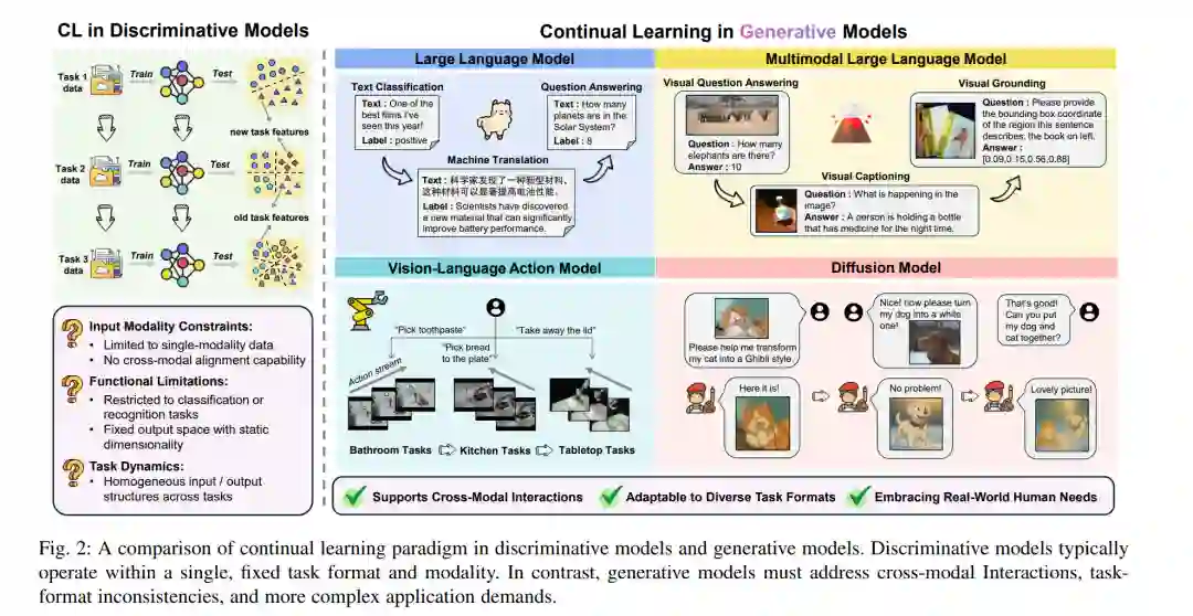 人工智能的发展正经历着从“理解世界”向“创造世界”的范式转变。传统的判别式模型,如分类网络 [1]–[6] 和目标检测器 [7]–[11],在过去十年中取得了显著的成功。这些模型擅长从大规模标注数据中学习决策边界,从而实现对已知概念的准确识别和判断。然而,这种基于判别的智能在创造性和泛化能力方面存在局限。它们在单一模态下对已知概念的区分能力突出,但在生成新颖内容以及在多模态之间建立语义关联方面却表现乏力。 生成模型的兴起有效弥补了这些不足,它们通过大规模预训练以捕捉数据的底层分布。由此,主流生成模型(如大语言模型 LLMs [12]–[14]、多模态大语言模型 MLLMs [15]–[19]、视觉-语言-动作模型 VLA [20], [21] 以及扩散模型 [22], [23])不仅能够解释输入特征,还能主动生成连贯的文本、逼真的图像,甚至跨模态内容。随着研究范式从判别式向生成式转变,人工智能正从“识别已知”进化为“创造未知”。这一转变正重新定义人机协作的基础,使生成能力更具表达性、灵活性和多模态性。 生成模型(如 GPT-4)的成功在根本上依赖于大规模预训练和人类对齐。然而,这一过程本质上是动态的,因为语言、数据分布和用户需求不断演化。更关键的是,不可能穷尽未来所有场景,这就要求模型具备持续学习(Continual Learning)的能力(如图 1 所示),以适应开放世界环境 [24]–[26]。例如,将通用模型(如 ChatGPT)微调于特定领域数据(如数学)时,尽管在目标任务上表现提升,但常常伴随着灾难性遗忘 [27]–[29] —— 即先前知识被迅速覆盖。当模型在多个下游任务上按序训练时,每一次更新都会进一步加剧灾难性遗忘,导致知识保持能力持续下降。 一个直接的解决方案是保留所有历史任务数据,并在学习新任务时进行联合训练。但由于存储成本高昂 [30] 或数据隐私问题 [31],该方案在现实中往往不可行。相比之下,人类在习得新知识时很少遭遇灾难性遗忘 [32], [33],这揭示了当前 AI 系统与人类学习能力之间的根本差距。为了弥合这一差距,持续学习作为研究方向 [34]–[38] 正受到越来越多关注,目标是使模型具备在不遗忘旧知识的前提下持续学习新任务的能力。 不同于传统判别式模型 [39],生成模型中的持续学习更加复杂。一方面,判别式模型主要建模条件概率(即 P(y|x)),灾难性遗忘主要表现为分类空间中决策边界的漂移 [40]–[44];而生成模型则学习联合概率分布(即 P(x, y)),或进行自回归生成,要求在开放生成空间中保持语义连贯性与知识完整性。因此,持续学习不仅要维护事实性知识表示,还需优化生成推理过程,以缓解幻觉现象 [45], [46] 和语义不一致 [47]。 另一方面,生成模型面临的任务形式更加多样,例如在多模态大语言模型(MLLMs)中涵盖视觉问答、图像描述、视觉指向等多种任务,这增加了灾难性遗忘的风险,并对多任务知识整合提出更高要求。相比之下,判别式模型通常聚焦于单一任务,持续学习难度相对较小。此外,生成模型涉及多模态输入,要求跨模态协调,传统面向单模态任务的持续学习方法往往难以胜任这些挑战。图 2 所示的这些挑战表明,生成模型中的持续学习仍是人工智能领域一个充满前景却尚未充分探索的研究方向。 目前的持续学习综述大多聚焦于某一类生成模型,如大语言模型(LLMs)[48]–[51] 或多模态大语言模型(MLLMs)[52]–[54]。尽管这些研究在各自领域内系统总结了相关方法,但缺乏跨生成模型的广泛讨论与关联。考虑到 AI 社区对生成模型与大规模统一模型研究热度的持续上升,我们认为,一篇全面、及时的综述有助于从整体视角指导后续研究。 因此,本文提出了首个面向生成模型的持续学习综合综述,系统分析了大语言模型、多模态大语言模型、视觉-语言-动作模型以及扩散模型中持续学习的关键方法与挑战。我们进一步在持续学习背景下,从方法维度对这四类生成模型进行了统一分析,探索其共同的理论基础。 本论文结构如下:第 2 节介绍持续学习的基本设置,包括基本定义、评估指标及方法分类;第 3 至第 6 节分别深入探讨大语言模型(第 3 节)、多模态大语言模型(第 4 节)、视觉-语言-动作模型(第 5 节)以及扩散模型(第 6 节)中的持续学习问题,包括训练策略、常用基准、模型架构,以及现有方法的动机与实现。第 7 节展望未来研究方向与新兴趋势。最后,第 8 节总结全文并介绍一个持续更新的 GitHub 项目库,用于追踪生成模型持续学习领域的最新进展。