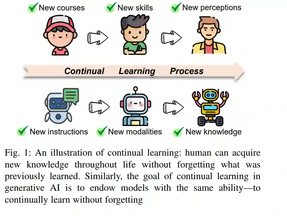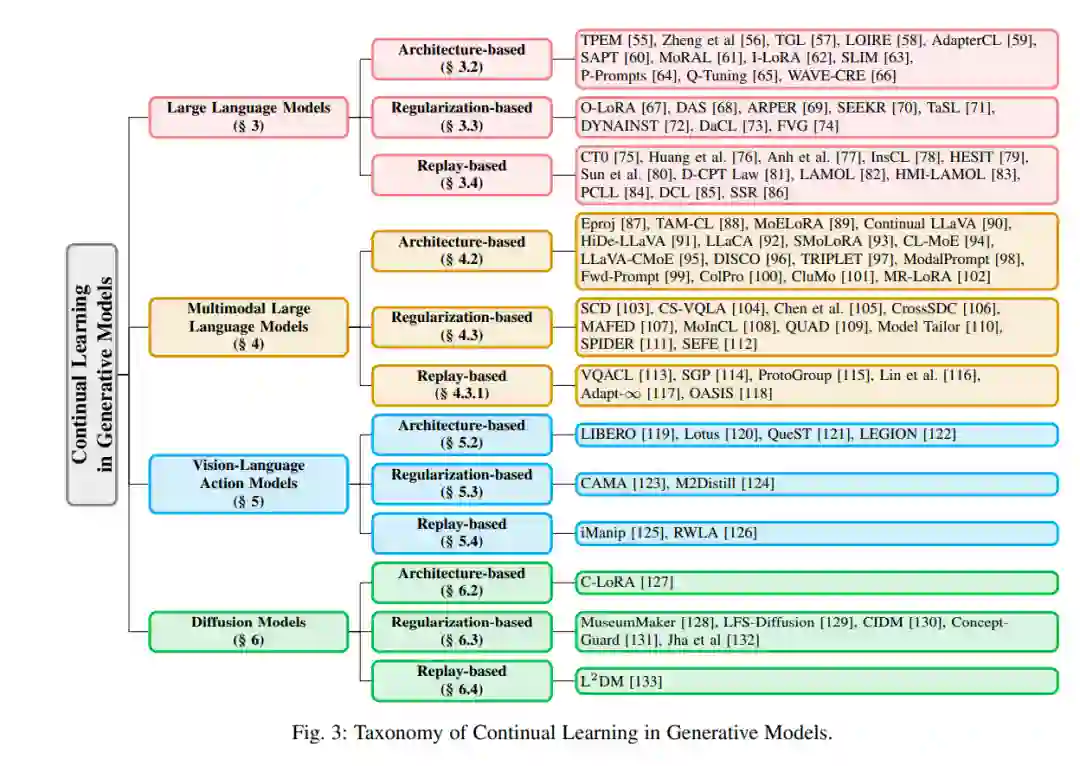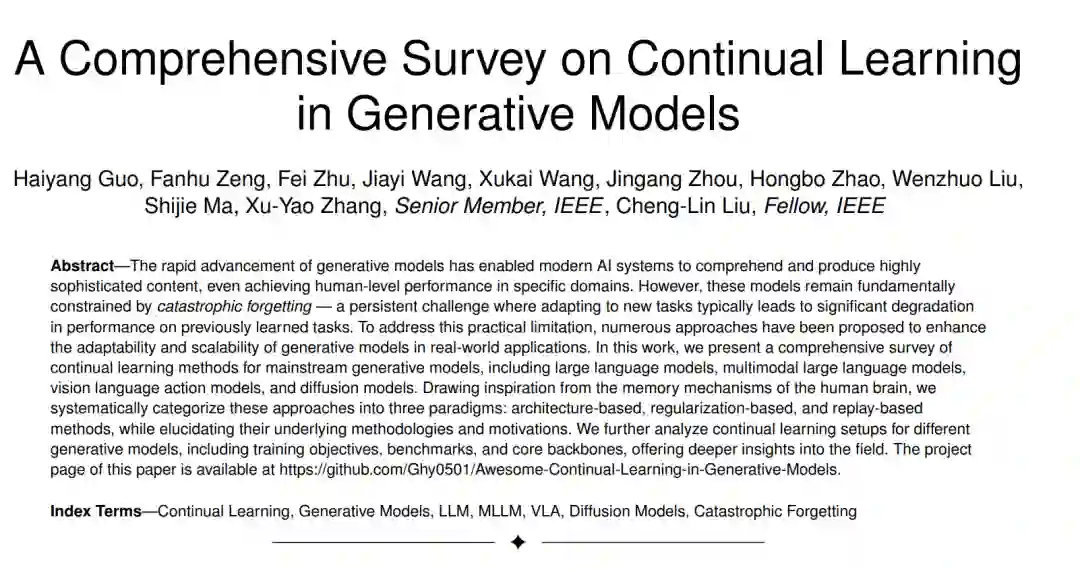 摘要 —— 生成模型的快速发展使现代人工智能系统能够理解并生成高度复杂的内容,甚至在某些特定领域达到与人类相当的水平。然而,这些模型仍然受到灾难性遗忘的根本性限制——即在适应新任务时,通常会显著损害对先前任务的表现。为了解决这一现实难题,研究者提出了大量方法,以提升生成模型在现实应用中的适应性和可扩展性。本文系统地综述了主流生成模型中持续学习的方法,包括大语言模型、多模态大语言模型、视觉-语言-动作模型,以及扩散模型。借鉴人脑的记忆机制,我们将现有方法系统地划分为三类范式:基于结构的方法、基于正则的方法和基于重放的方法,并深入剖析其核心原理与动机。此外,我们还分析了不同生成模型下的持续学习设置,包括训练目标、评测基准和关键骨干架构,旨在为该领域提供更深层次的洞见。论文项目主页见:https://github.com/Ghy0501/Awesome-Continual-Learning-in-Generative-Models。 关键词 —— 持续学习,生成模型,大语言模型(LLM),多模态大语言模型(MLLM),视觉-语言-动作模型(VLA),扩散模型,灾难性遗忘