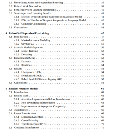**训练基于深度神经网络的自动语音识别(ASR)模型通常需要数千小时的转录数据,将其限制在少数语言中。此外,目前最先进的声学模型基于Transformer架构,该架构随着序列长度的二次增长,阻碍了其对长序列的使用。本文旨在减少(a)数据和(b)开发最先进的ASR系统的计算需求,只有几百小时或更少的转录数据。本文的第一部分着重于减少训练这些模型所需的转录数据量。本文提出一种使用dropout进行不确定性感知半监督学习的方法。该方法为未标记数据的训练产生了更好的假设。研究了两种流行的自监督预训练方法的域外和跨语言泛化:掩码声学建模和wav2vec 2.0。两种预训练方法都可以泛化到未见过的域,并明显优于仅用监督数据训练的模型。https://infoscience.epfl.ch/record/297304?ln=en在第二部分中,专注于减少Transformer模型的计算需求,(a)通过设计高效的注意力计算形式,(b)通过减少注意力计算的输入上下文长度。**本文首次提出"线性"注意力,使用注意力的核公式将自回归transformer表示为递归神经网络,并将序列长度的计算复杂度从二次降低到线性。提出"聚类"注意力,通过对输入序列进行聚类并使用质心进行计算来近似自注意力。在给定的计算预算下,聚类注意力优于普通注意力。对于ASR,我们发现线性注意力导致词错误率下降,而聚类在处理较短序列时引入了开销。为解决这一限制,本文开发了一种方法,用均值池化对输入进行随机下采样,以实现高效的wav2vec 2.0训练。这使得在推理过程中可以在不同的压缩因子下使用相同的模型。对wav2vec 2.0预训练的随机压缩,能够为转录数据有限的语言建立计算高效的ASR模型。