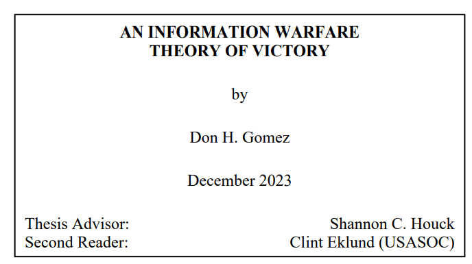 本论文探讨了信息战中的评估挑战及其与信息环境中的 "制胜"观念之间的关系。论文认为,错位的激励机制和组织偏见导致评估不充分,无法满足利益相关者的知识需求。本文引入了信息战制胜理论,认为应利用 "愿景"、"真相"、"感知 "和 "数量 "等概念来实现预期的信息目标。为验证该理论,开发了一个信息战游戏和相关模拟,结果表明,数量在决定对胜利的主观看法方面起着关键作用。论文提出了三项主要建议: 1) 负责信息活动的领导者应激励信息量;2) 应采用和尝试其他方法来证明成功;3) 应将信息活动对友军的影响纳入综合信息评估。本论文认识到实施这些建议的内在挑战,并呼吁官僚勇敢地克服这些挑战。