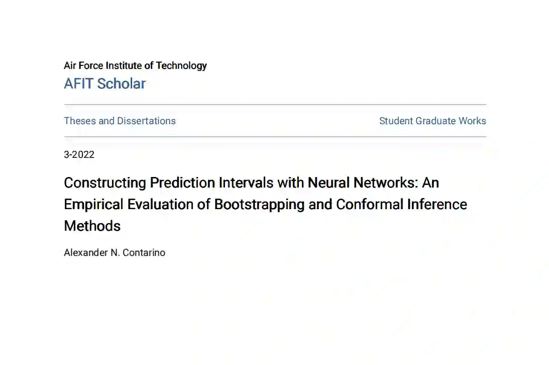 人工神经网络(ANN)已经成为完成一系列机器学习任务的流行工具,包括预测连续结果。然而,通常与预测相关的置信度的缺乏限制了它们的适用性,特别是在准确性至关重要的军事环境下。用预测区间(PI)来补充点预测是其他学习算法的常见做法,但ANN的复杂结构和训练使构建PI变得困难。如何在保持合理的计算时间的前提下,为ANNs的预测最好地构建最佳性能的PI是一个开放的问题。此外,人们对ANN构建的哪些因素会影响PI的性能知之甚少,这里定义为覆盖率和效率等术语。这项研究回答了这些问题,通过在11个不同大小和维度的数据集(包括一个基于图像的数据集)上执行两步实验来构建前馈神经网络的PI。两种非参数方法,即自举和保形推理,被考虑用于构建PI。第一个实验步骤的结果显示,某些设计选择,如网络的激活、节点数和层数,确实会影响PI的性能。为了优化PI的覆盖范围和效率,无论是使用自举还是保形推理,都对这些网络设计特征提供了指导意见。在第二步中,实施了20种不同的构建PI的算法--每种算法都利用了引导或保形推理的原则--以确定哪种算法能提供最好的性能,同时承担合理的计算负担。结果表明,一般来说,优化这种权衡的方法是交叉共形法,它在减少计算负担的同时保持了区间覆盖和效率。这项工作提供了设计选择和推理方法,可以为神经网络创建性能更好的预测区间,以便使其适应军事用途的先进算法。