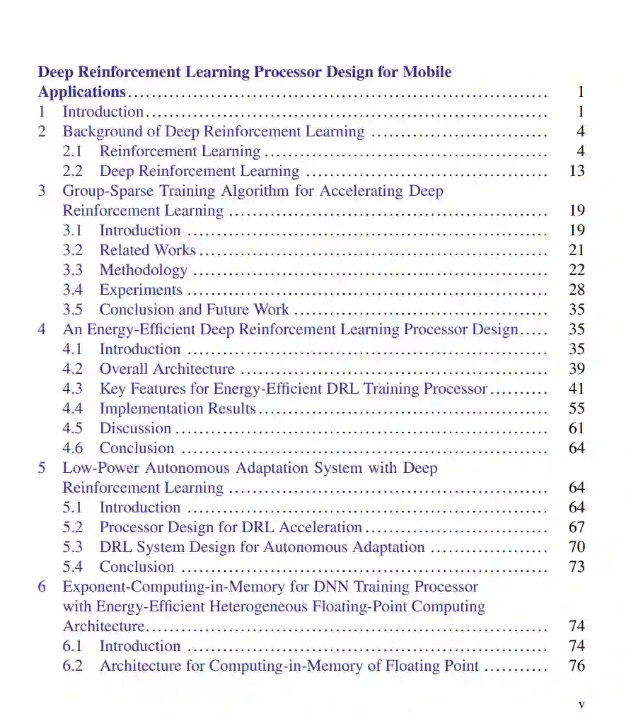 除了第2章以外,所有章节都基于此作者之前的研究[5-8]。更具体地说,第3章基于“GST:集团稀疏训练用于加速深度强化学习”[5]。第4章基于“OmniDRL:带有双模式权重压缩和片上稀疏权重转置器的29.3 TFLOPS/W深度强化学习处理器”[6]。第5章基于“低功耗自主适应系统与深度强化学习”[7]。第6章基于“ECIM:为能效高的异构浮点DNN训练处理器在内存中进行指数计算”[8]。第2章基于此作者之前的出版物[9],以及一些DRL综述论文、书籍和课程,如[10, 11],David Silver的RL课程,以及Sergey Levine的深度RL课程。
