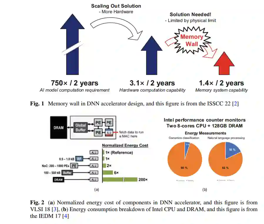 最近,在DNN加速器设计中,内存成本的部分变得占主导地位。这是因为存在一个“内存墙”问题,即处理器和内存之间的性能差距。尽管处理器的逻辑受益于技术的快速进步,但内存的改进却无法跟上这种进步。图1显示了DNN加速器设计中的内存墙[2]。DNN模型的快速发展每两年需要计算需求增加750倍。硬件的计算能力每两年增加3.1倍。然而,内存系统的能力只是每两年增长1.4倍。此外,我们可以通过集成更多的硬件来扩展计算能力,但由于物理限制,很难扩展内存能力。图2a显示了DNN加速器中各组件的标准化能源成本[3]。DNN加速器集成了用于计算的处理引擎(PEs)、作为L1缓存的基于触发器的寄存器文件、作为L2缓存的基于刮擦板存储器的全局缓冲器,以及作为主内存的DRAM。与PE中的计算能源成本相比,缓冲器访问和DRAM访问的能源成本要高得多。因此,需要频繁访问内存的DNN会受到大量内存能源消耗的影响。图2b显示了使用2颗英特尔8核CPU和128GB DRAM测得的计算和内存的能源分解[4]。对于基因组分类,内存消耗了整体能源的95%。对于自然语言处理,内存消耗了整体能源的82%。
