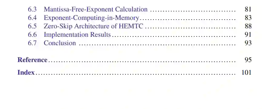 在第6节中,我们提出了一个异构浮点(FP)计算架构,通过分别优化指数处理和尾数处理来最大化能效。我们提出的在内存中进行指数计算(ECIM)的架构和无尾数的指数计算(MFEC)算法,降低了内存和FP MAC的功耗,同时解决了之前在内存中进行浮点计算处理器的局限性。此外,我们实施并在28nm CMOS技术中制造了一个具有所提出特性和稀疏性利用支持的bfloat16 DNN训练处理器。在支持CIM架构的FP操作时,它实现了13.7 TFLOPS/W的能效。