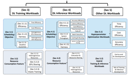 本文的结构如下: 第2节描述了DL工作负载的独特特征以及GPU数据中心调度的挑战。它也说明了这次调研的范围。本次调研的主体部分如图1所示。具体而言,第3节和第4节分别基于调度目标和资源消耗特征对训练和推理工作量进行了详细的分类。第5节讨论了其他工作负载,例如超参数优化、混合训练和推理工作负载。在每一节的末尾也给出了这些研究的启示。第6节总结了这篇调研论文,并确定了调度程序设计的未来方向。